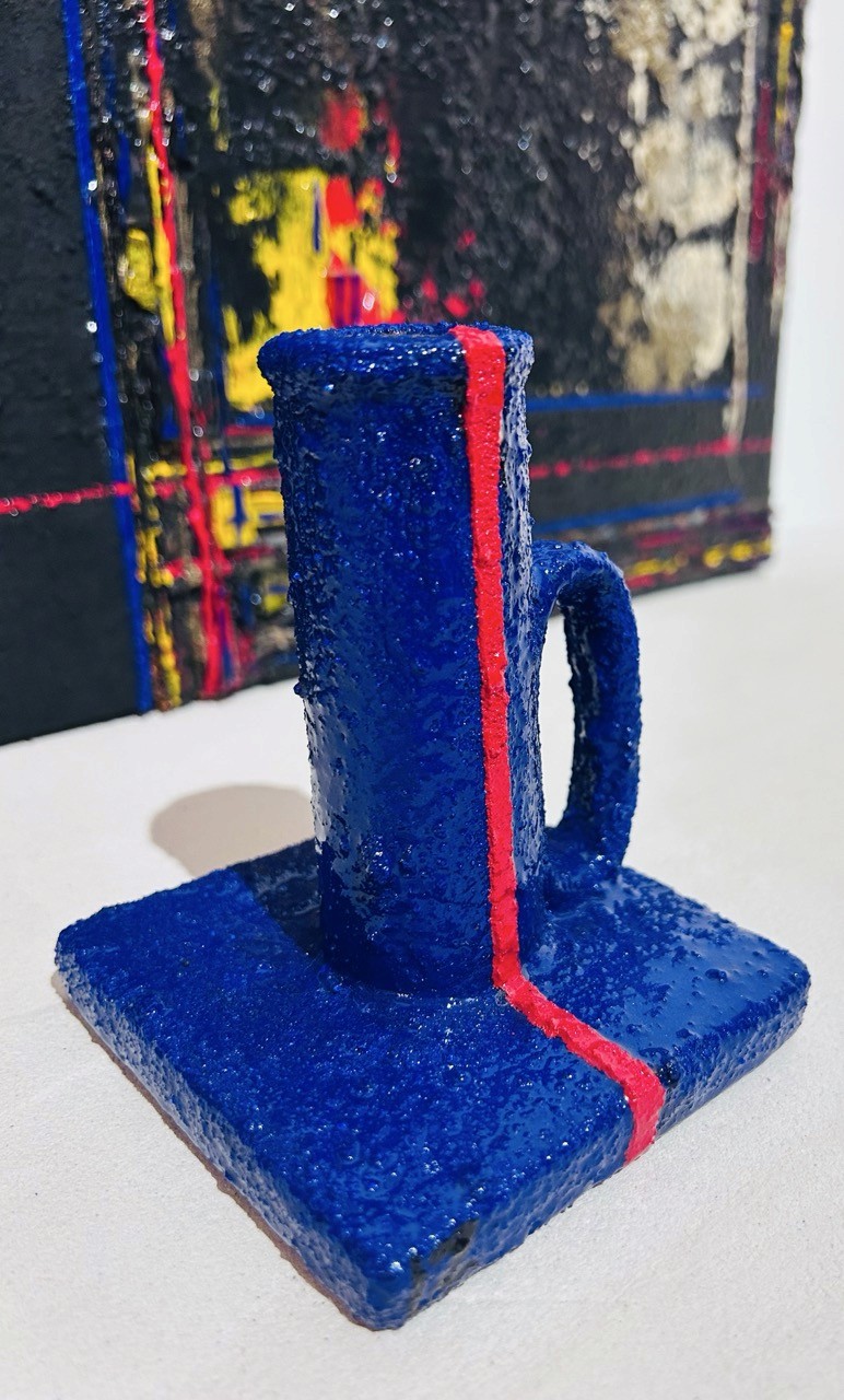 Le bougeoir est peint à la main et recouvert de résine pour en préserver la force et la brillance. Le bleu profond évoque la mer Égéée, le silence du labyrinthe, la nuit des questionnements. Et cette ligne rouge — ce fil ardent — guide l'œil, éclaire l'âme, embrase l'objet.