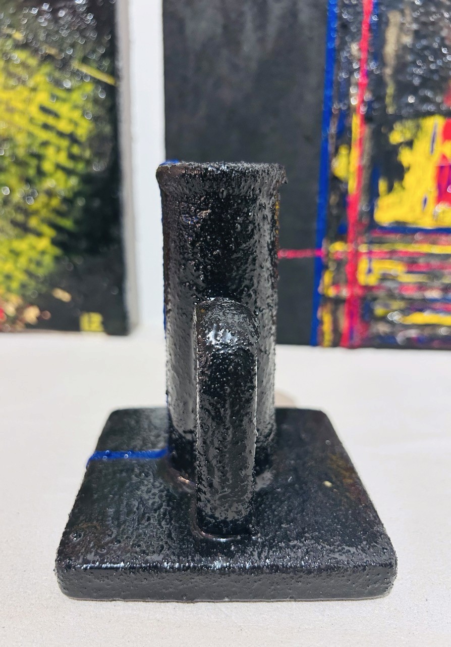 Le bougeoir est peint à la main et recouvert de résine pour en préserver la force et la brillance. Le noir laqué reflète la lumière comme une nuit liquide, profonde, énigmatique. Et cette ligne bleue — ce fil de lumière — guide l'œil, éclaire l'âme, traverse l'objet.