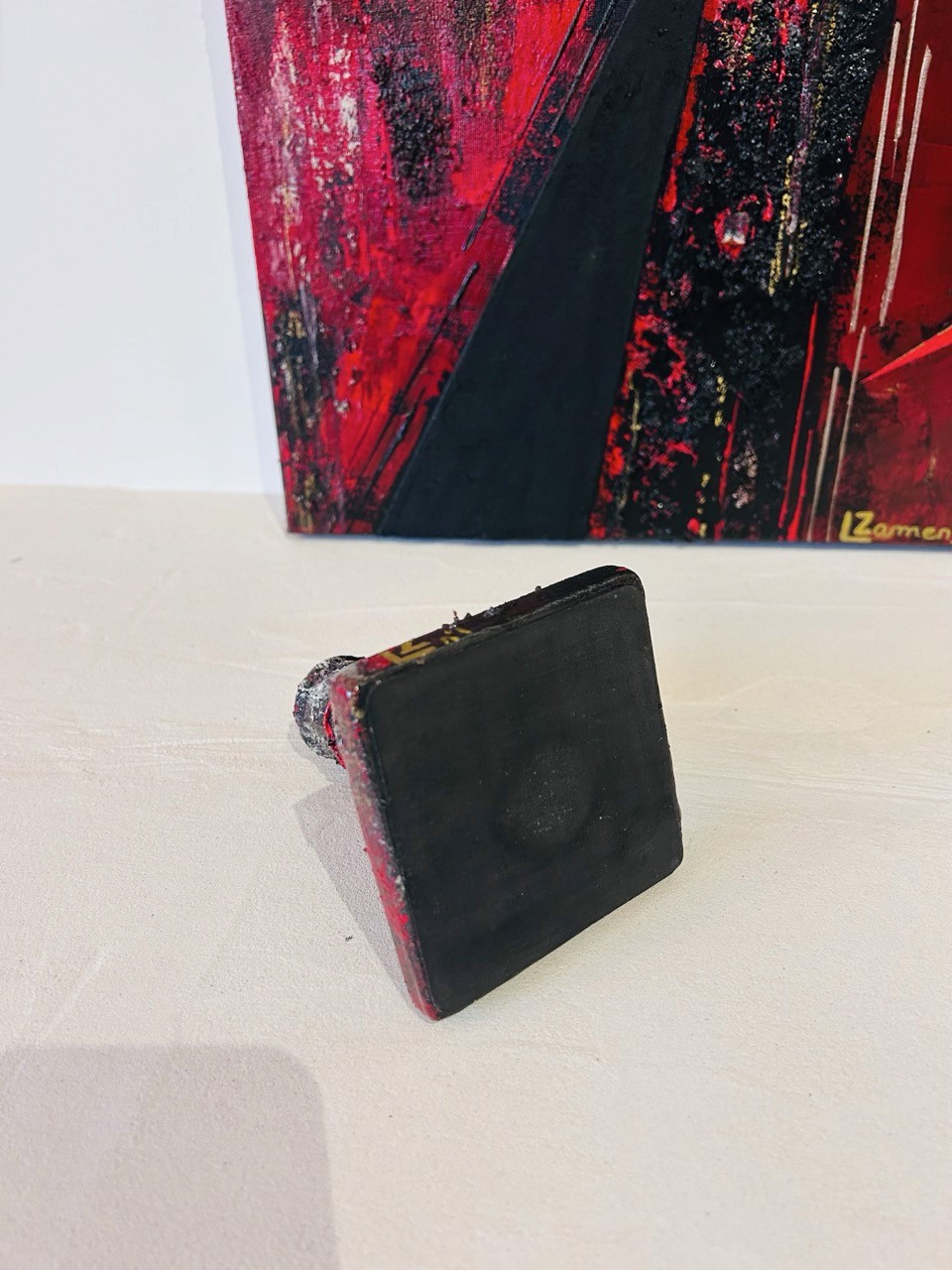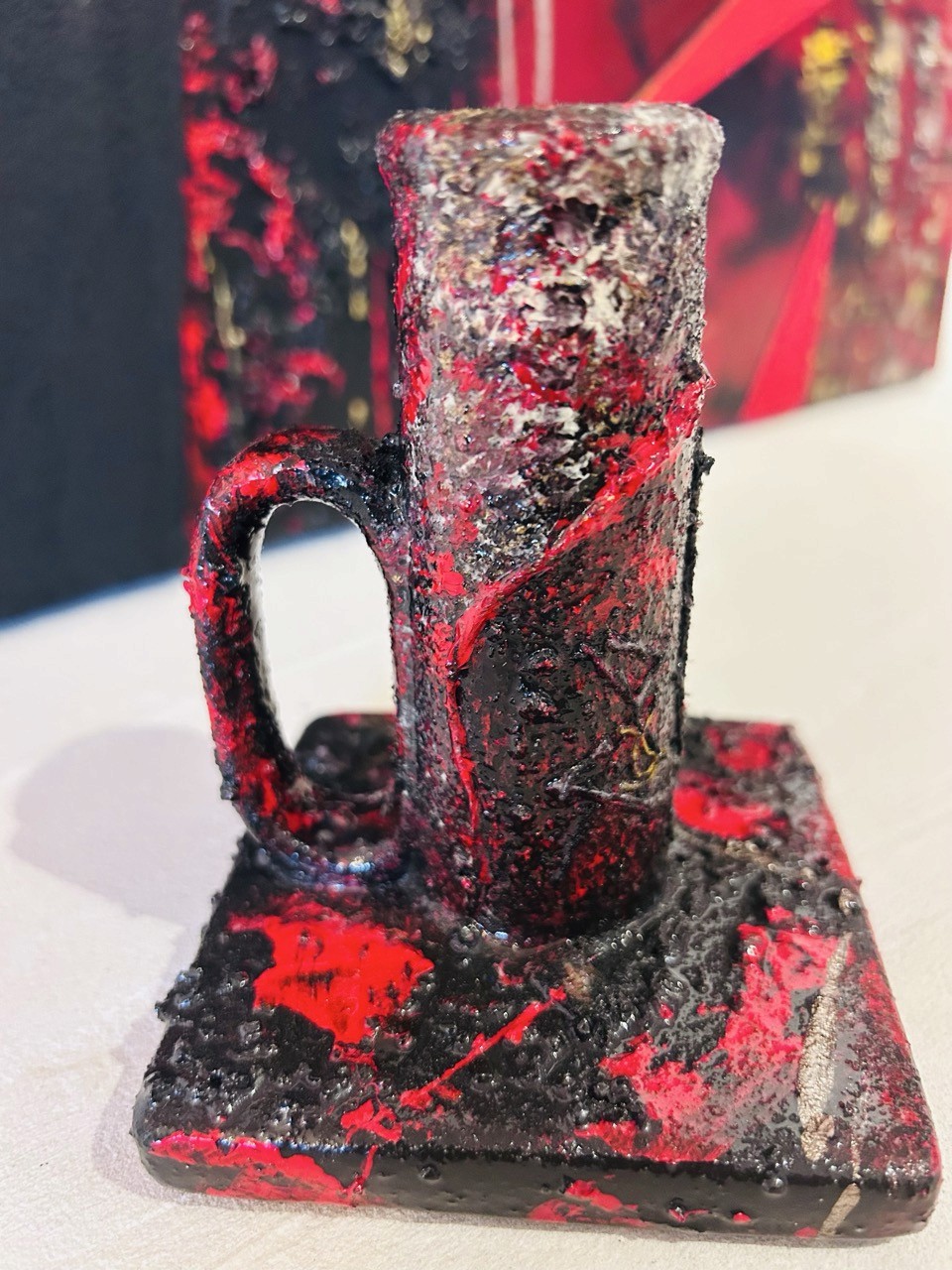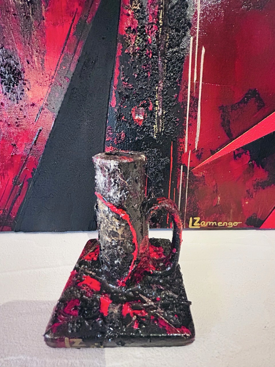 Les couleurs rouge, noir et argenté s'entrelacent, vibrantes et silencieuses à la fois. Un fil rouge de tissu traverse la pièce — discret mais essentiel — comme une veine, une mémoire, une tension. Il devient l'axe invisible autour duquel s'articule le reste : matière, énergie, émotion.