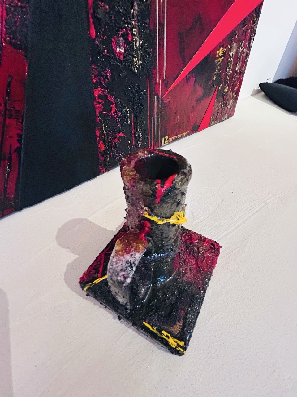 Les couleurs — rouge, noir et jaune — s'y entremêlent, vibrantes et silencieuses à la fois. Un fil jaune de tissu traverse la pièce. Discret mais essentiel — comme une veine, une mémoire, une tension. Il devient l'axe invisible autour duquel s'articulent la matière, l'énergie, l'émotion.