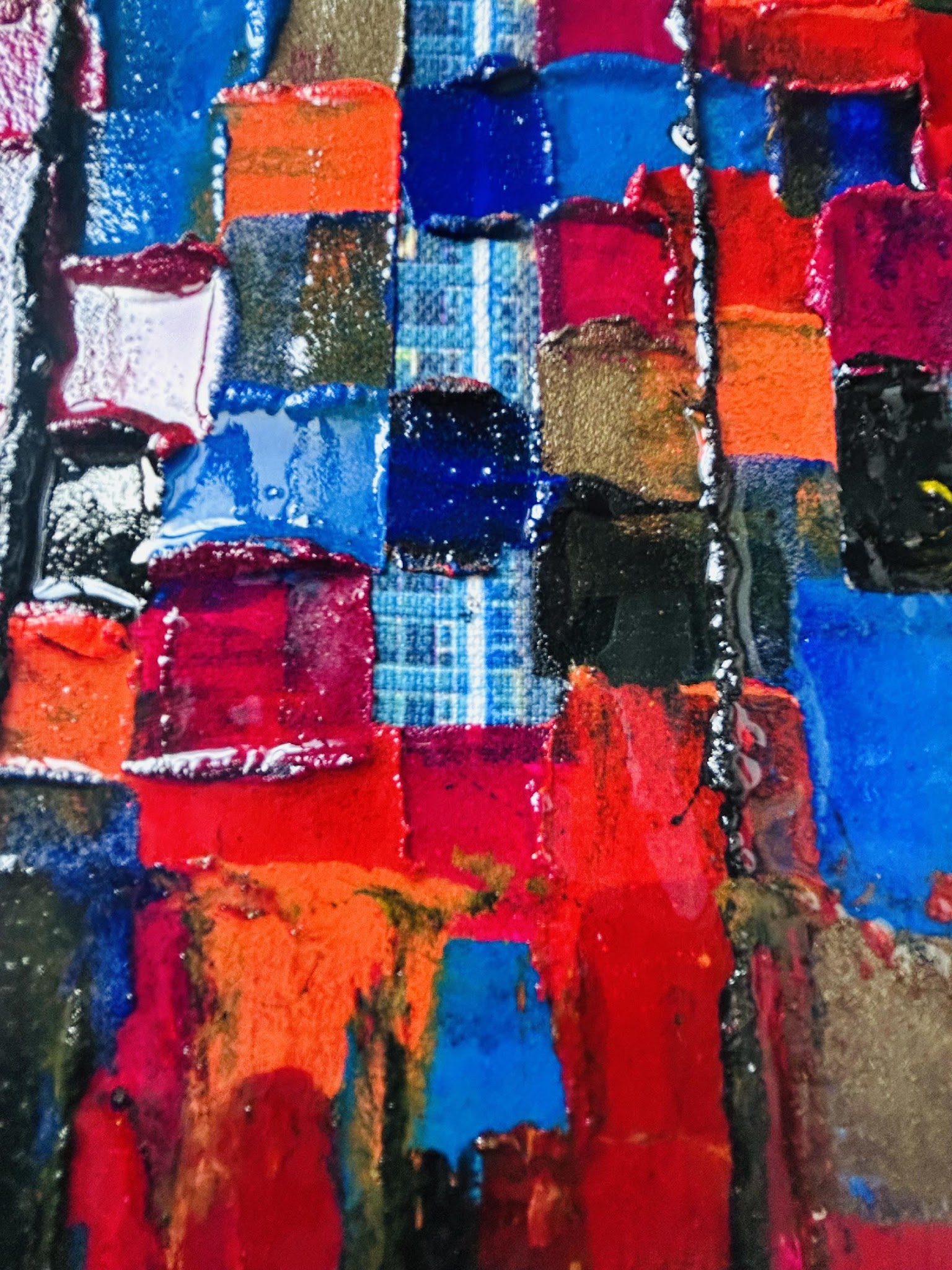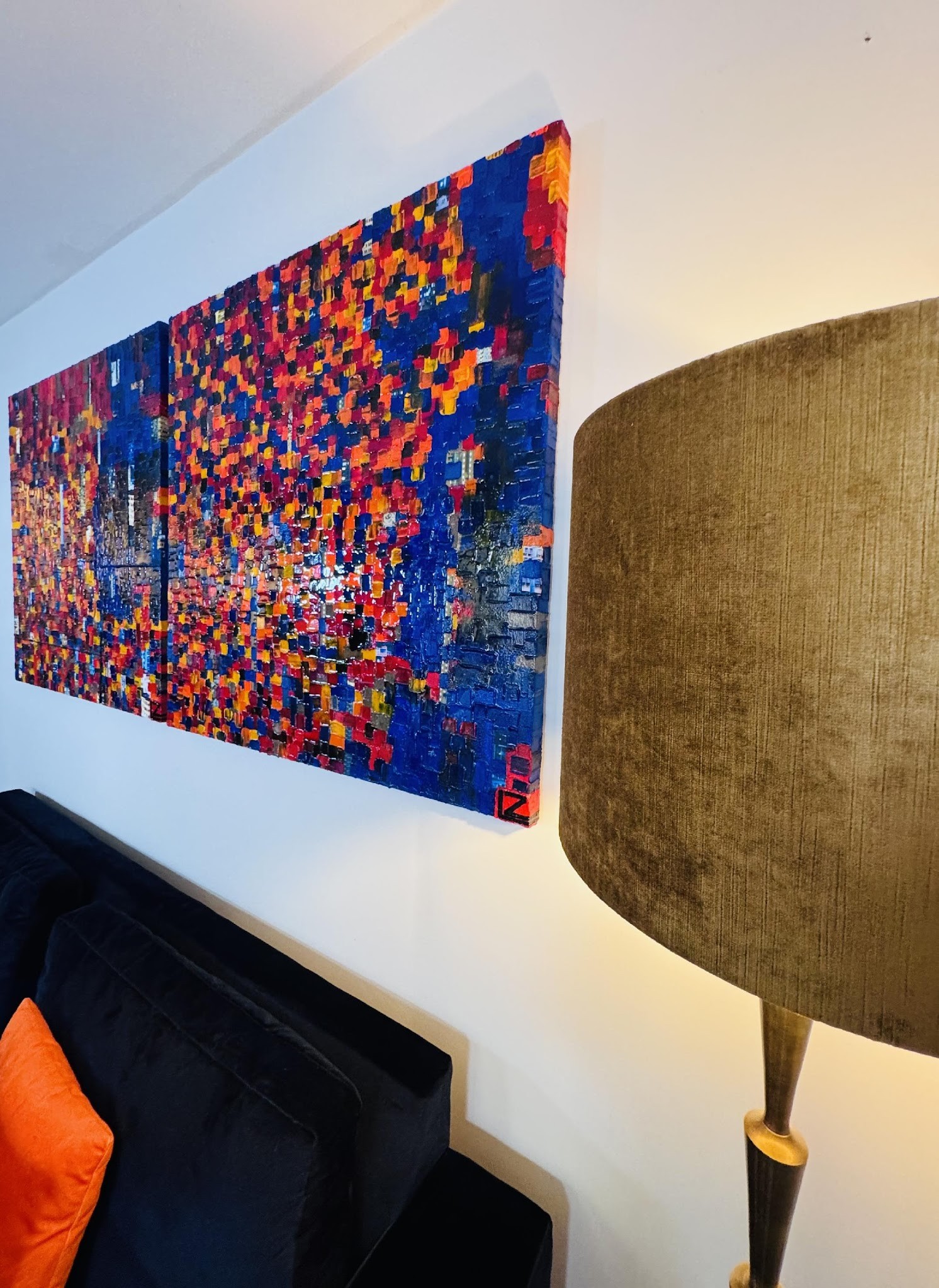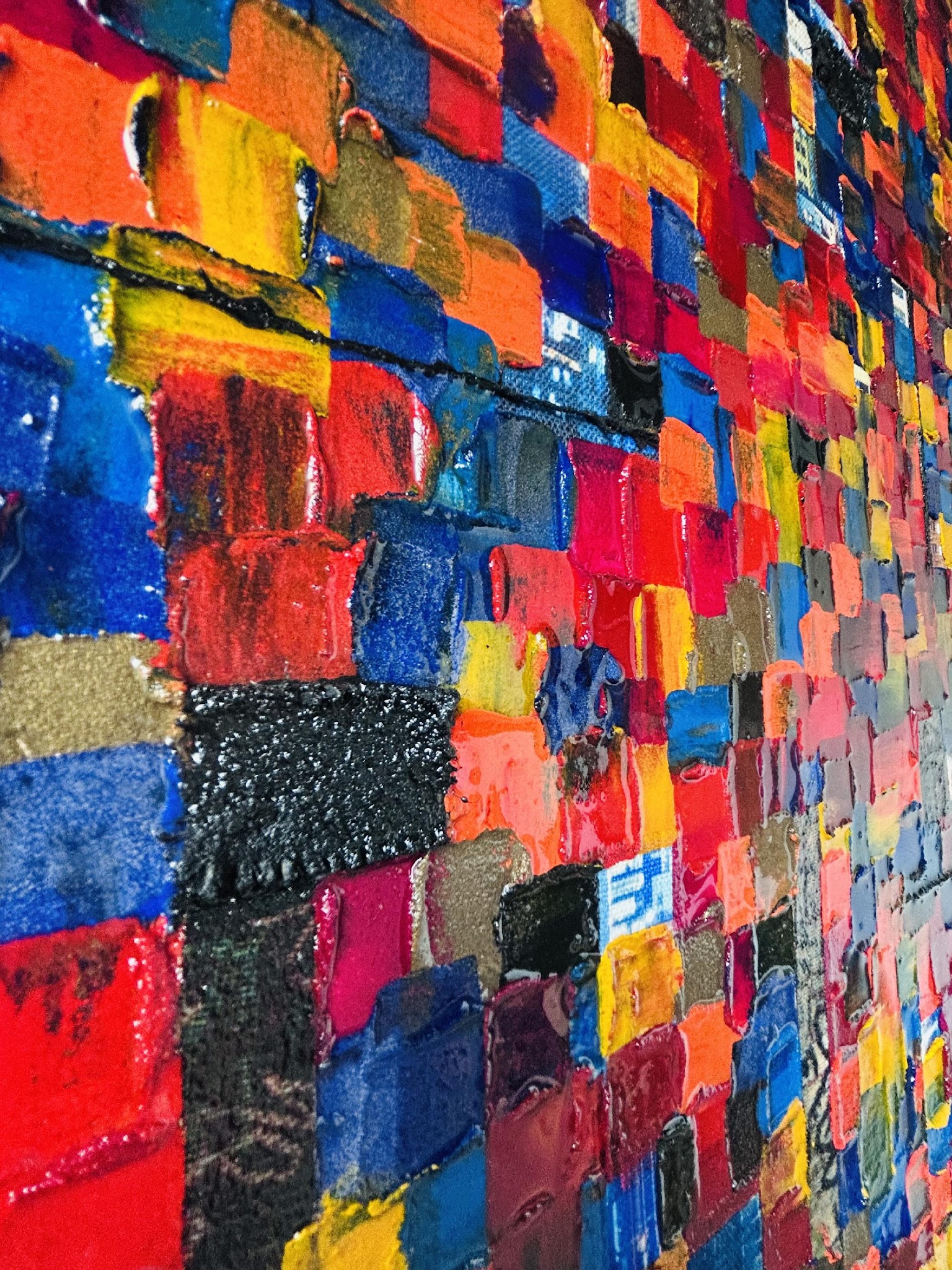 Œuvre originale N°1 de la série. Une composition vibrante de 100x100 cm où la résine sublime les reliefs de la mosaïque. Chaque carré est une parcelle de mémoire. À exposer seule ou en duo avec une autre toile de la série. Cette toile s'intègre parfaitement dans une composition murale avec d'autres formats de la série.