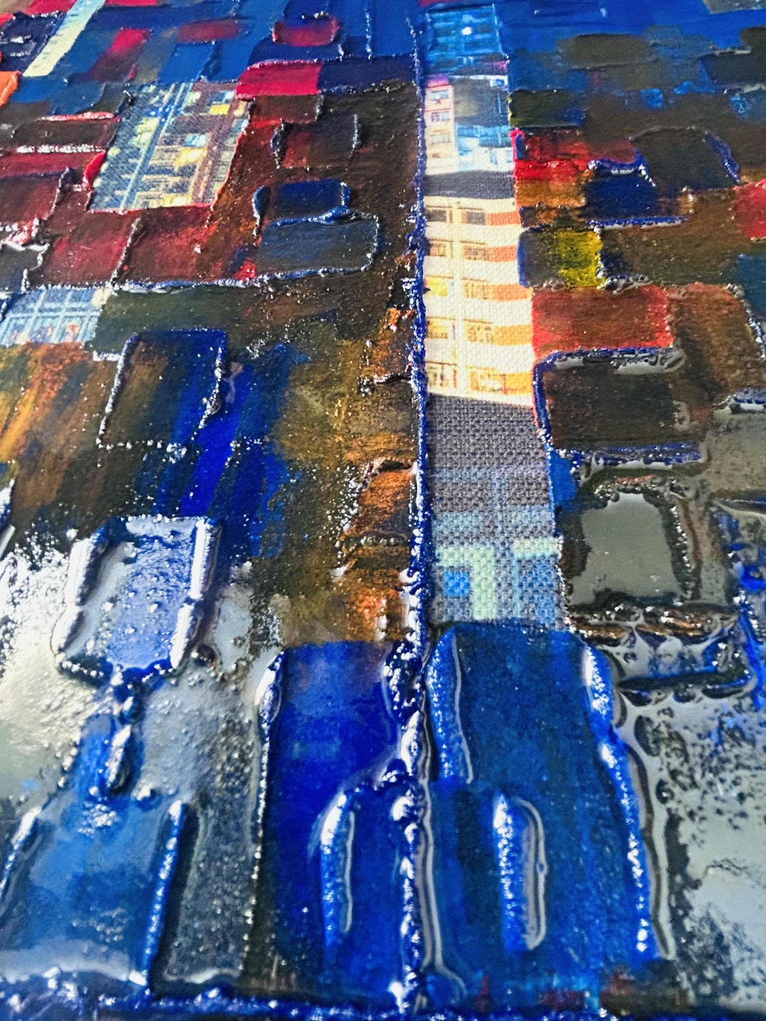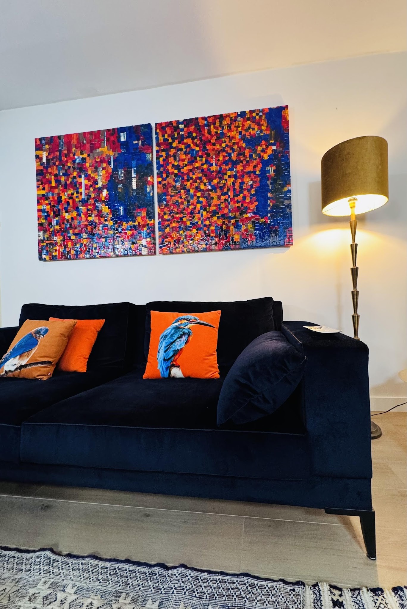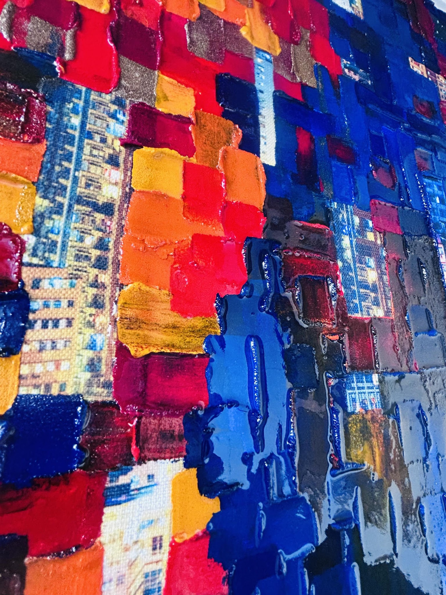 Œuvre originale N°1 de la série. Une composition vibrante de 100x100 cm où la résine sublime les reliefs de la mosaïque. Chaque carré est une parcelle de mémoire. À exposer seule ou en duo avec une autre toile de la série. Cette toile s'intègre parfaitement dans une composition murale avec d'autres formats de la série.