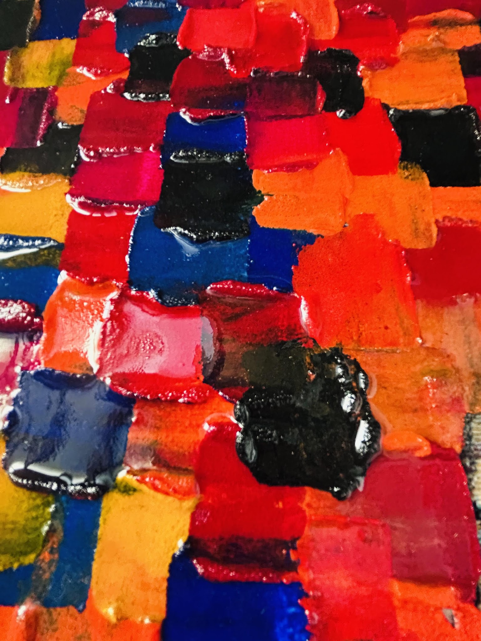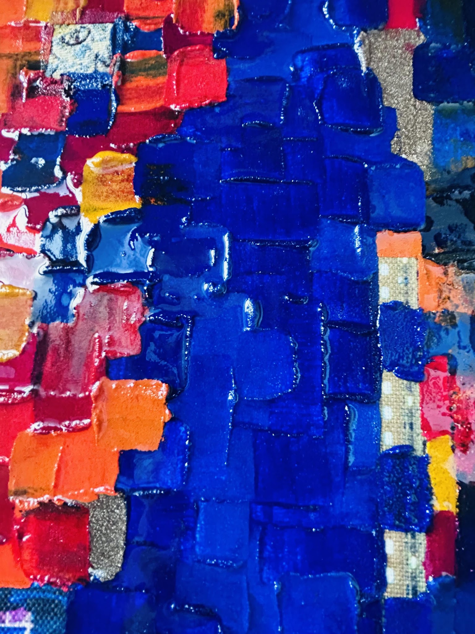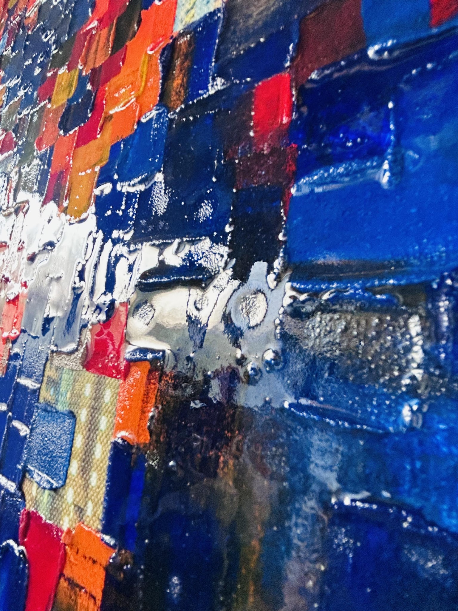 Pièce unique N°2. Cette toile carrée offre une topographie imaginaire riche en textures. La finition résine apporte une brillance "eau" qui contraste avec la matière brute du sable et du tissu. Cette toile s'intègre parfaitement dans une composition murale avec d'autres formats de la série.