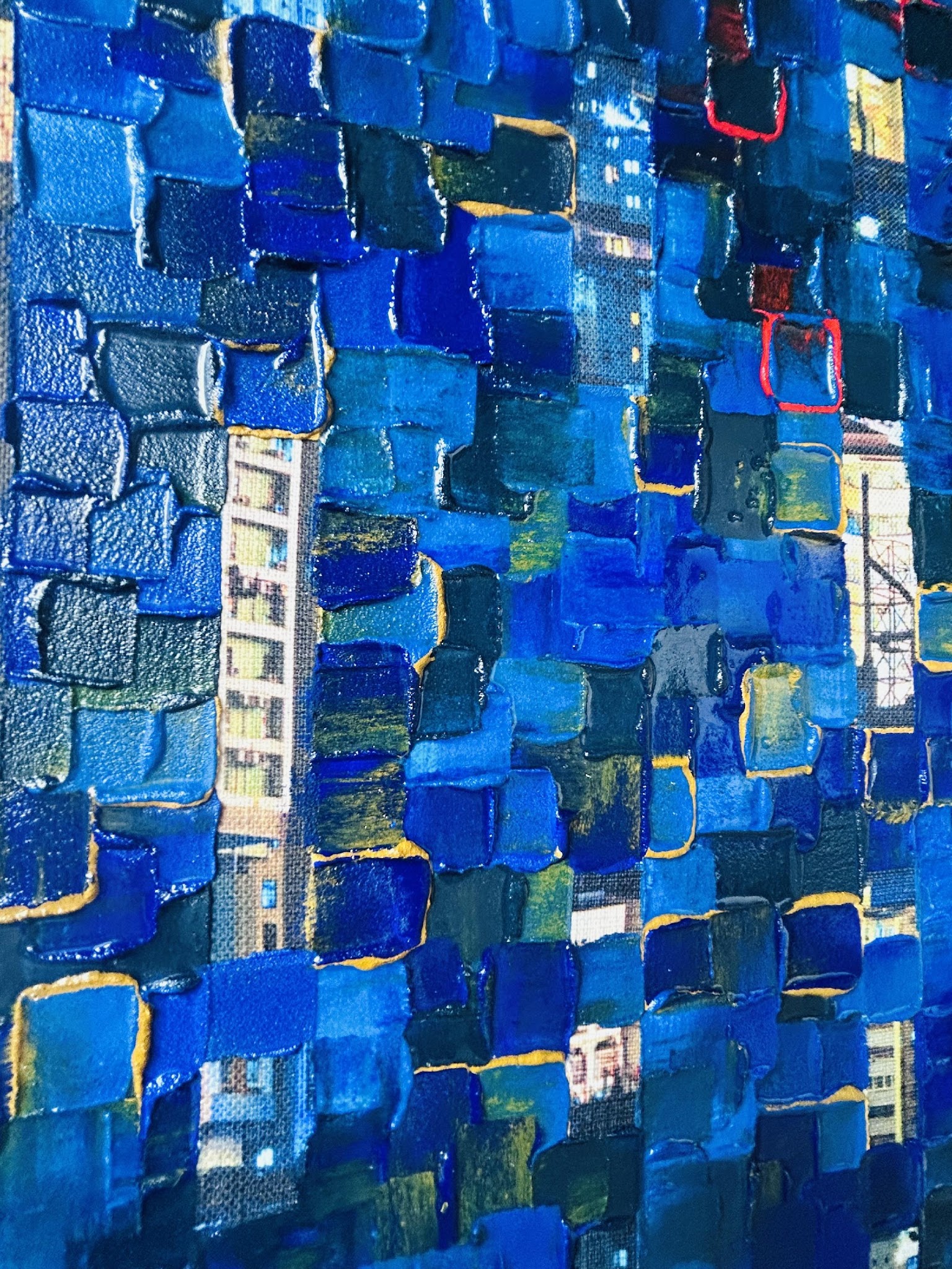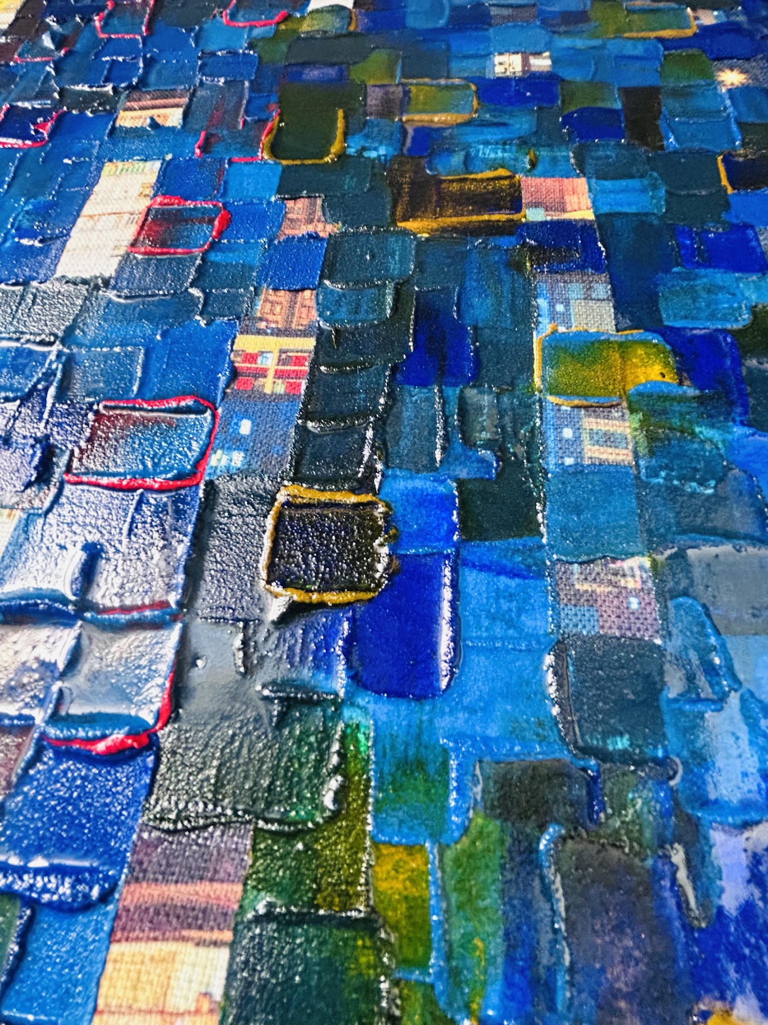 Œuvre carrée de 80 cm. Un fragment de cartographie affective aux couleurs vibrantes. Cette toile s'intègre parfaitement dans une composition murale avec d'autres formats de la série.