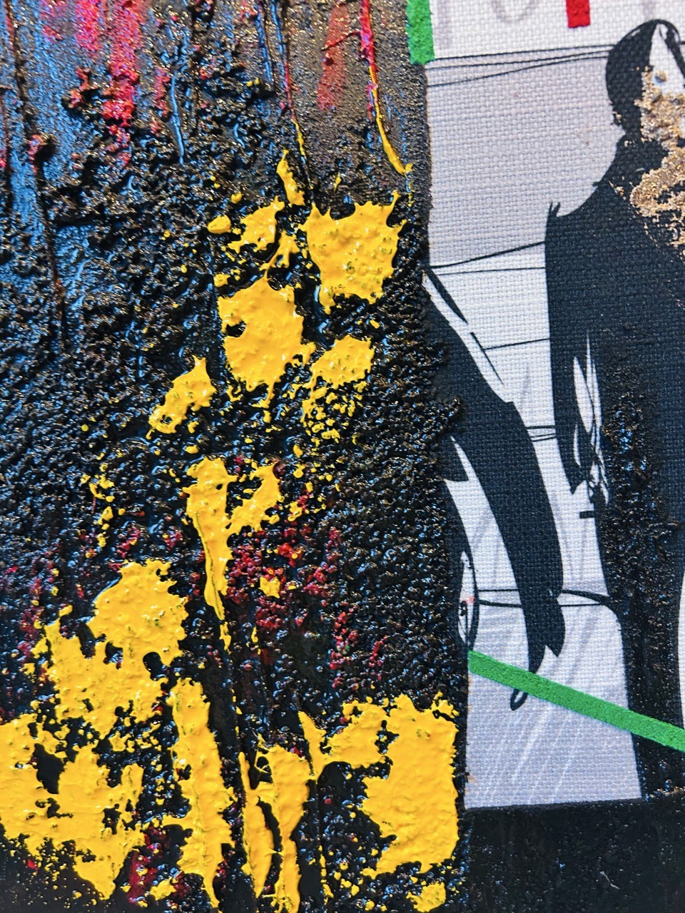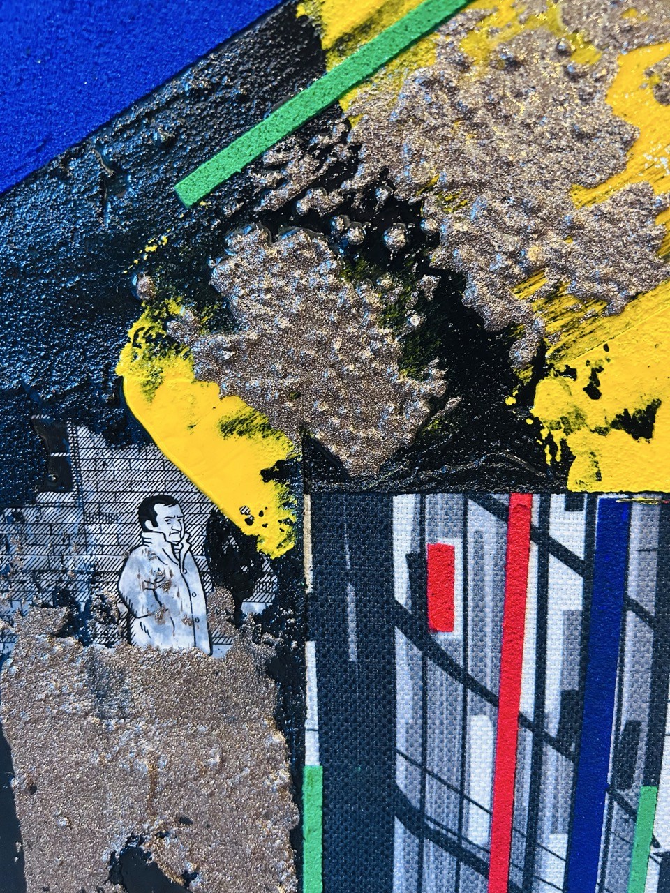 Mais il n’en sort pas librement. Des triangles vifs, jaune, bleu, rouge, l’assaillent, comme des flèches visuelles, agressives, presque hostiles. La couleur devient tension, le graphisme devient collision.