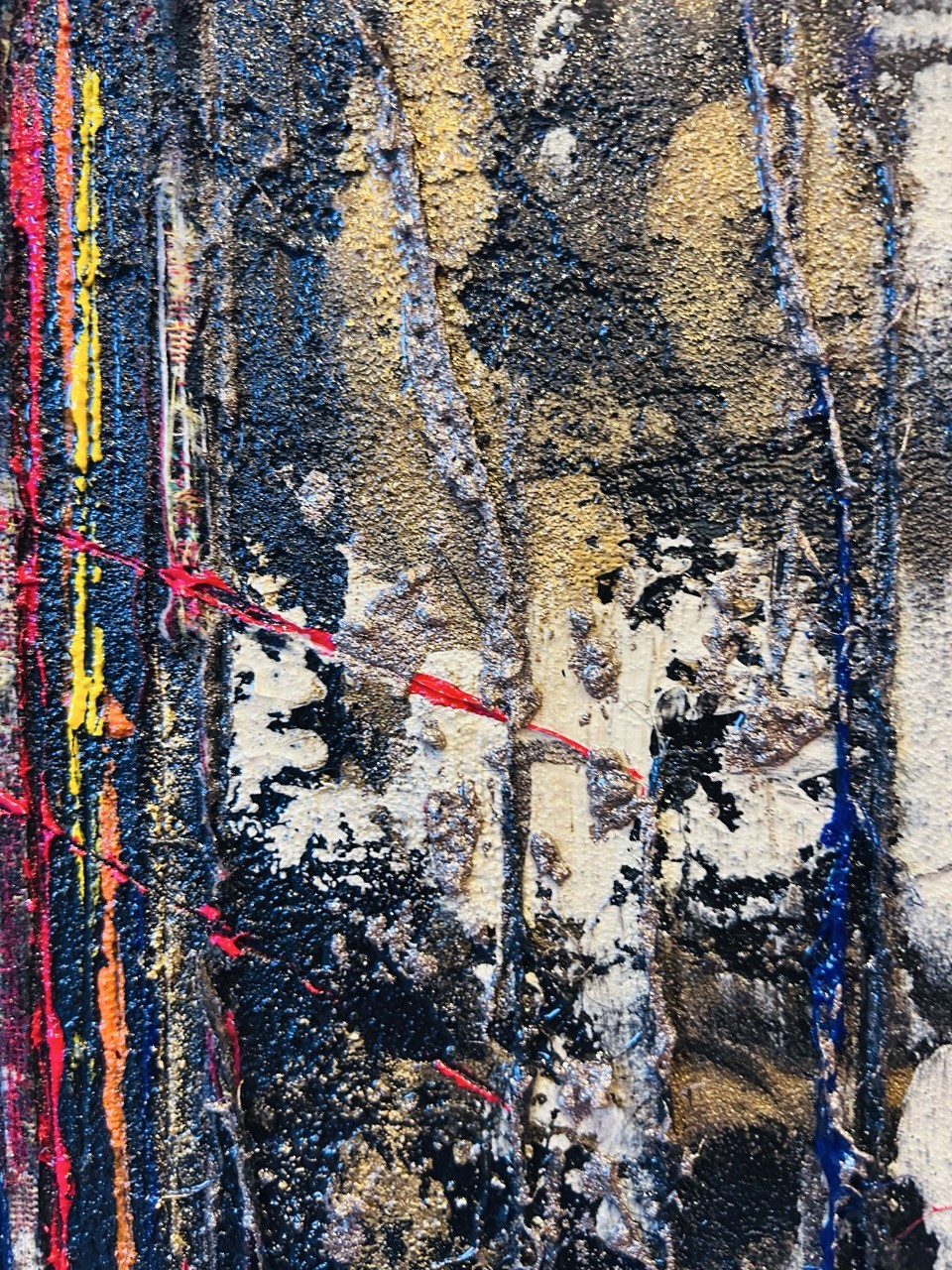 Des buildings verticaux, dressés comme des piliers implacables, inscrivent sur la toile la hauteur, la densité, l’étouffement. Le temps y est encapsulé, suggéré par des lignes verticales, rigides et répétées – comme une mesure sans fin.