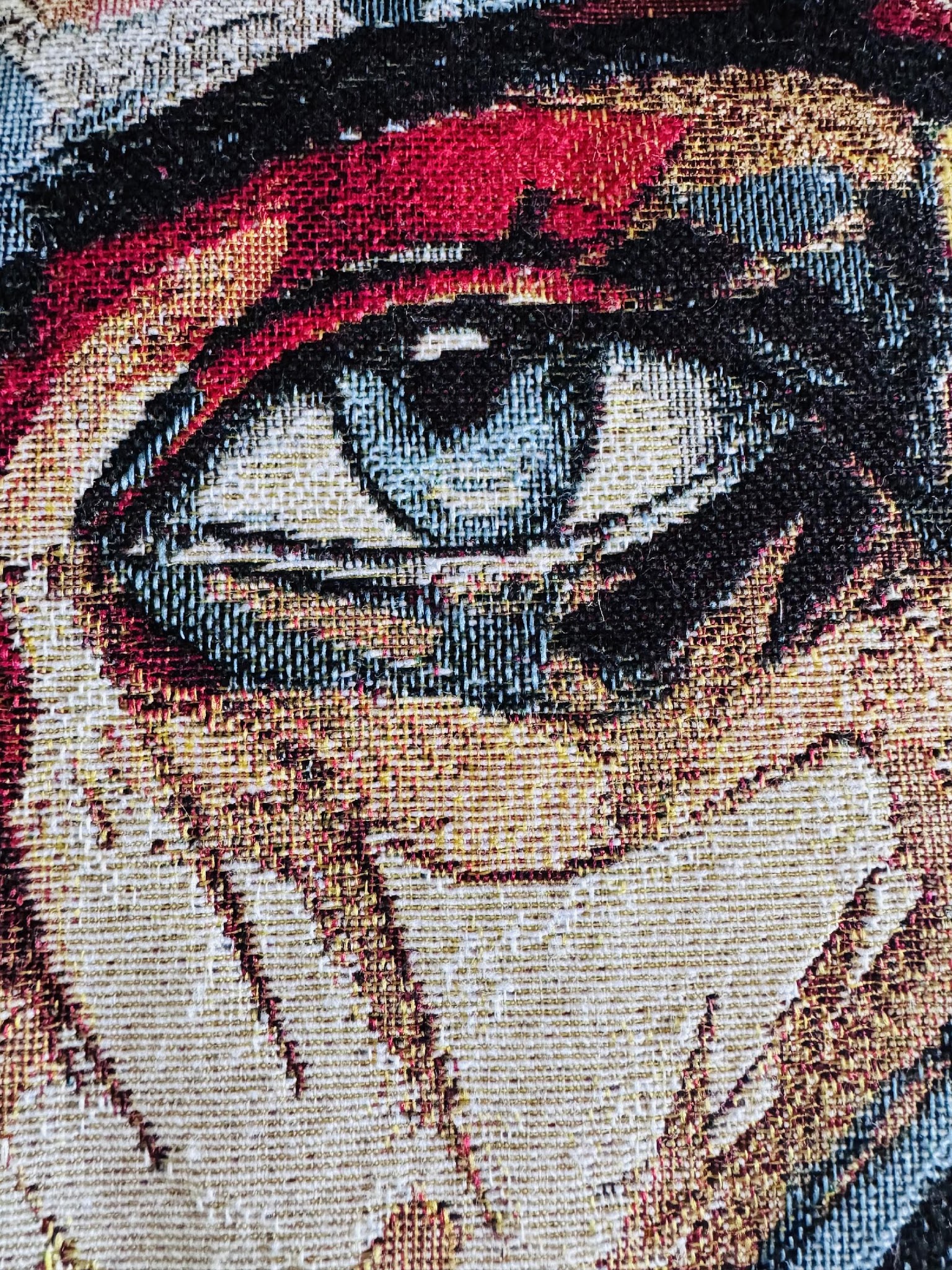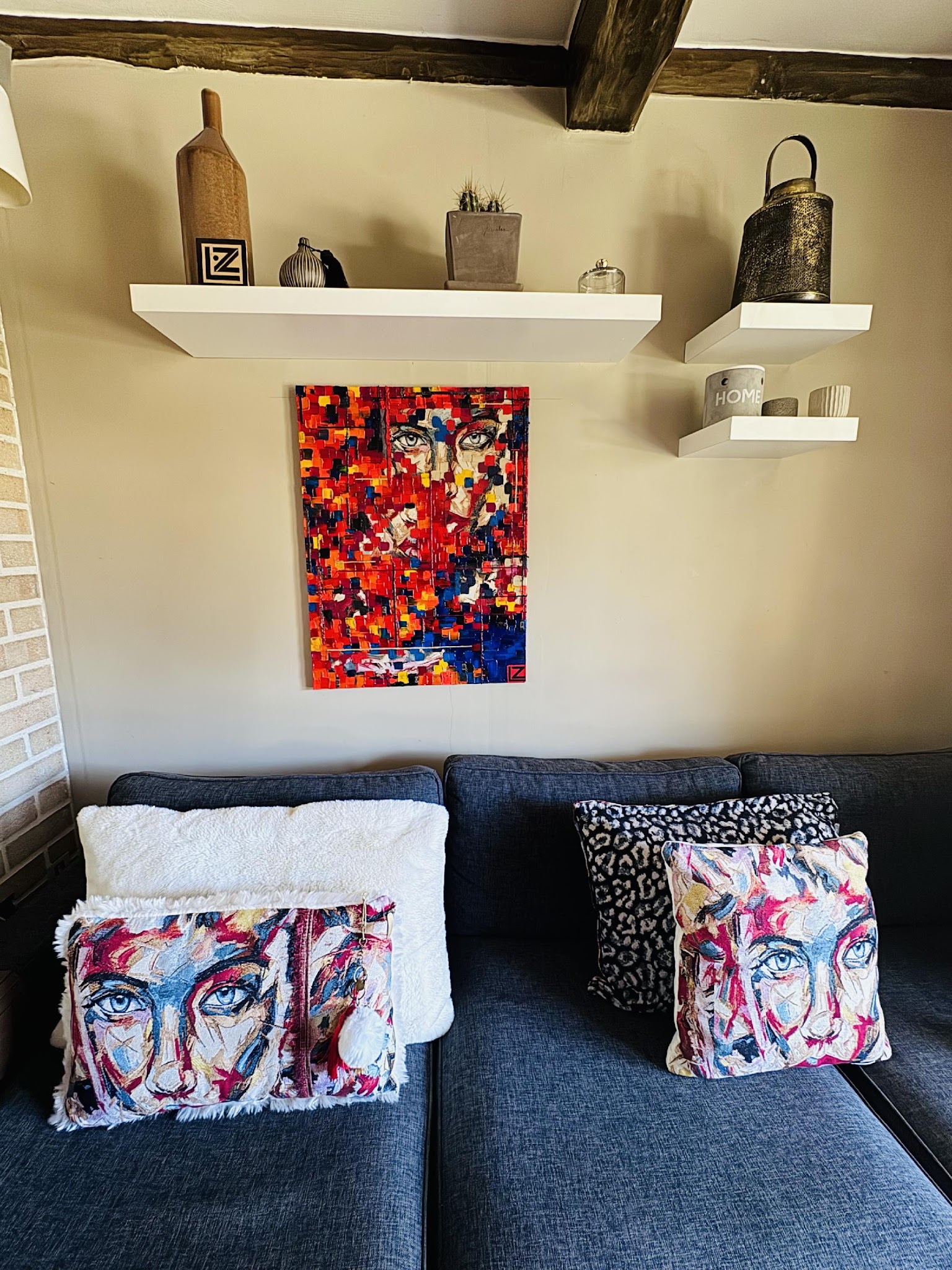 Ce coussin de la série « Reflet de l'âme » a été conçu comme une extension unique de la peinture. Il est réalisé avec le tissu Jacquard identique à celui utilisé sur la toile, assurant une continuité parfaite entre l'œuvre et l'objet.