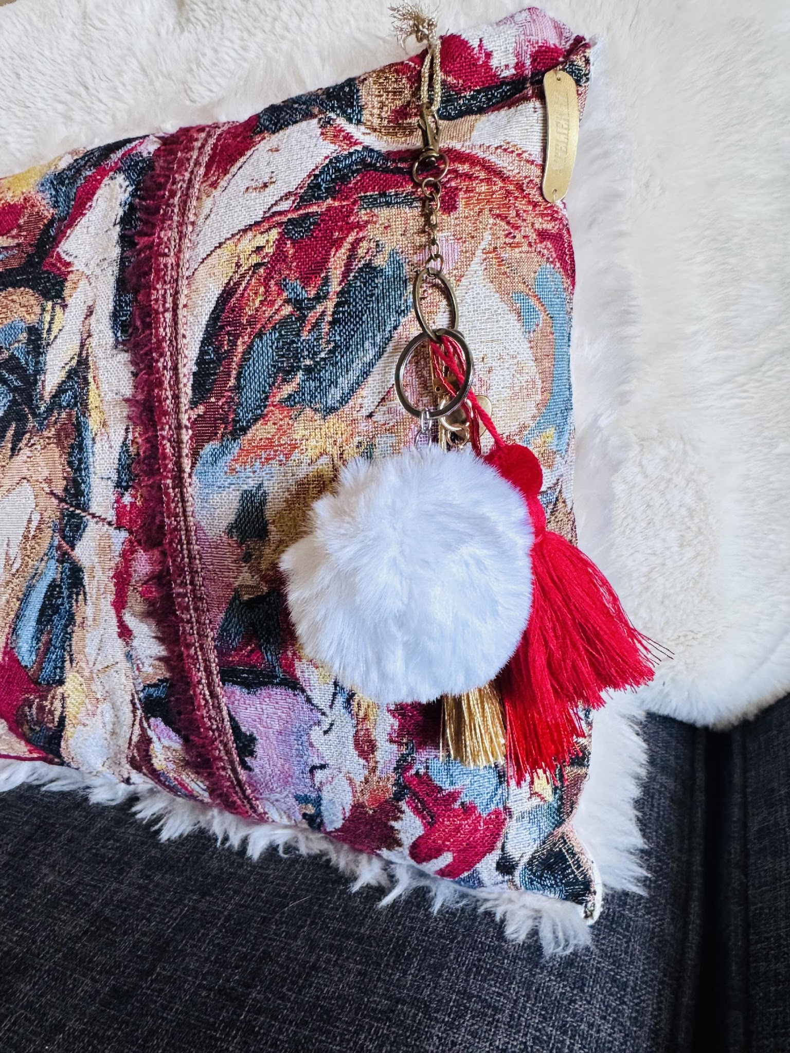 Ce modèle se distingue par sa confection bi-matière recto/verso, offrant un jeu de textures riche. Un porte-clés à breloques amovible vient souligner l'élégance de l'ensemble. Il est entièrement déhoussable grâce à une fermeture éclair.