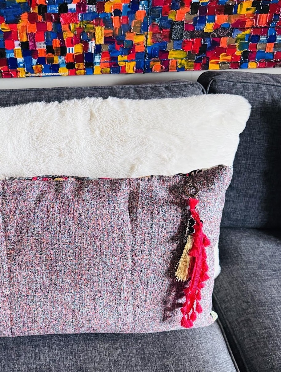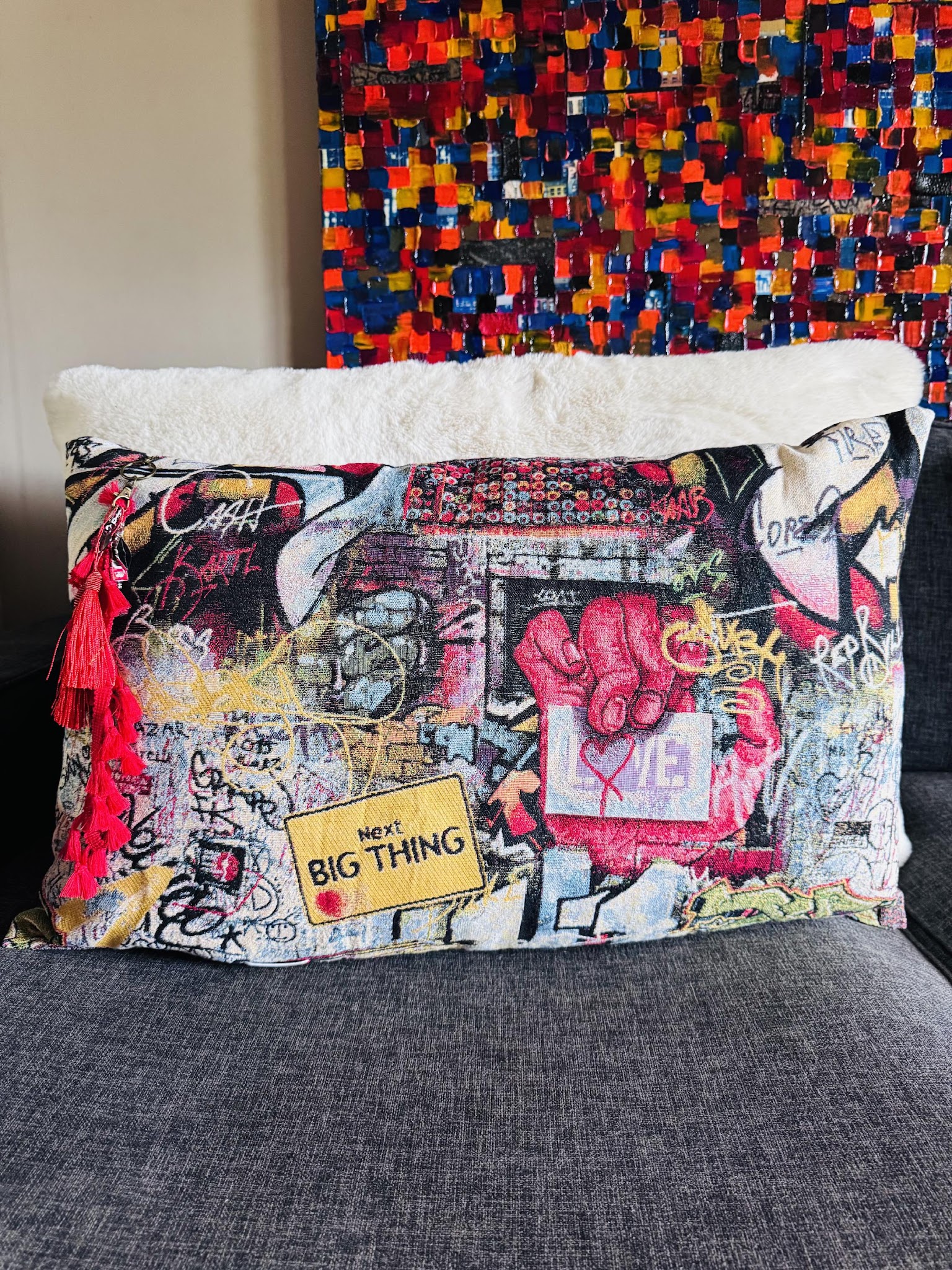 Ce coussin issu de la collection « Graffiti » a été imaginé pour s'intégrer avec harmonie dans votre intérieur, en parfait complément de la toile. Il est confectionné dans le tissu Jacquard utilisé pour la création de l’œuvre, proposé ici dans un format bi-matière original.