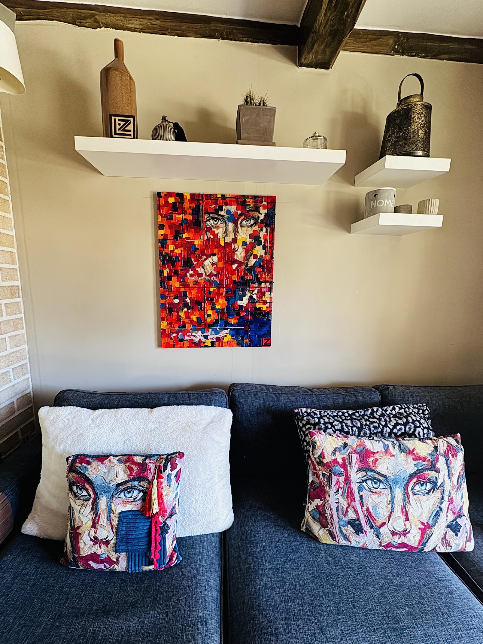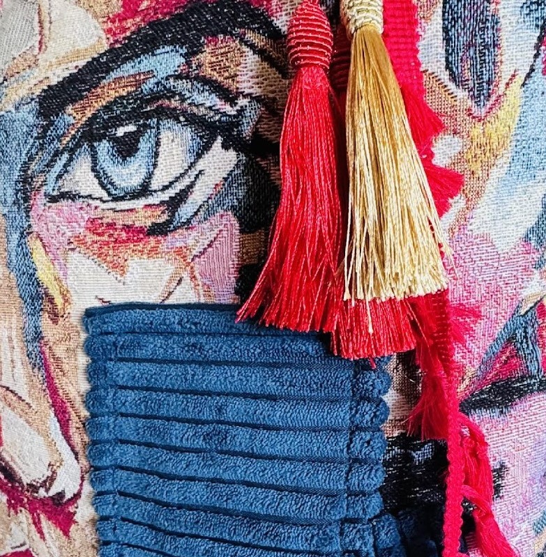 Ce coussin de la série « Reflet de l'âme » a été conçu comme une extension unique de la peinture. Il est réalisé avec le tissu Jacquard identique à celui utilisé sur la toile, assurant une continuité parfaite entre l'œuvre et l'objet.