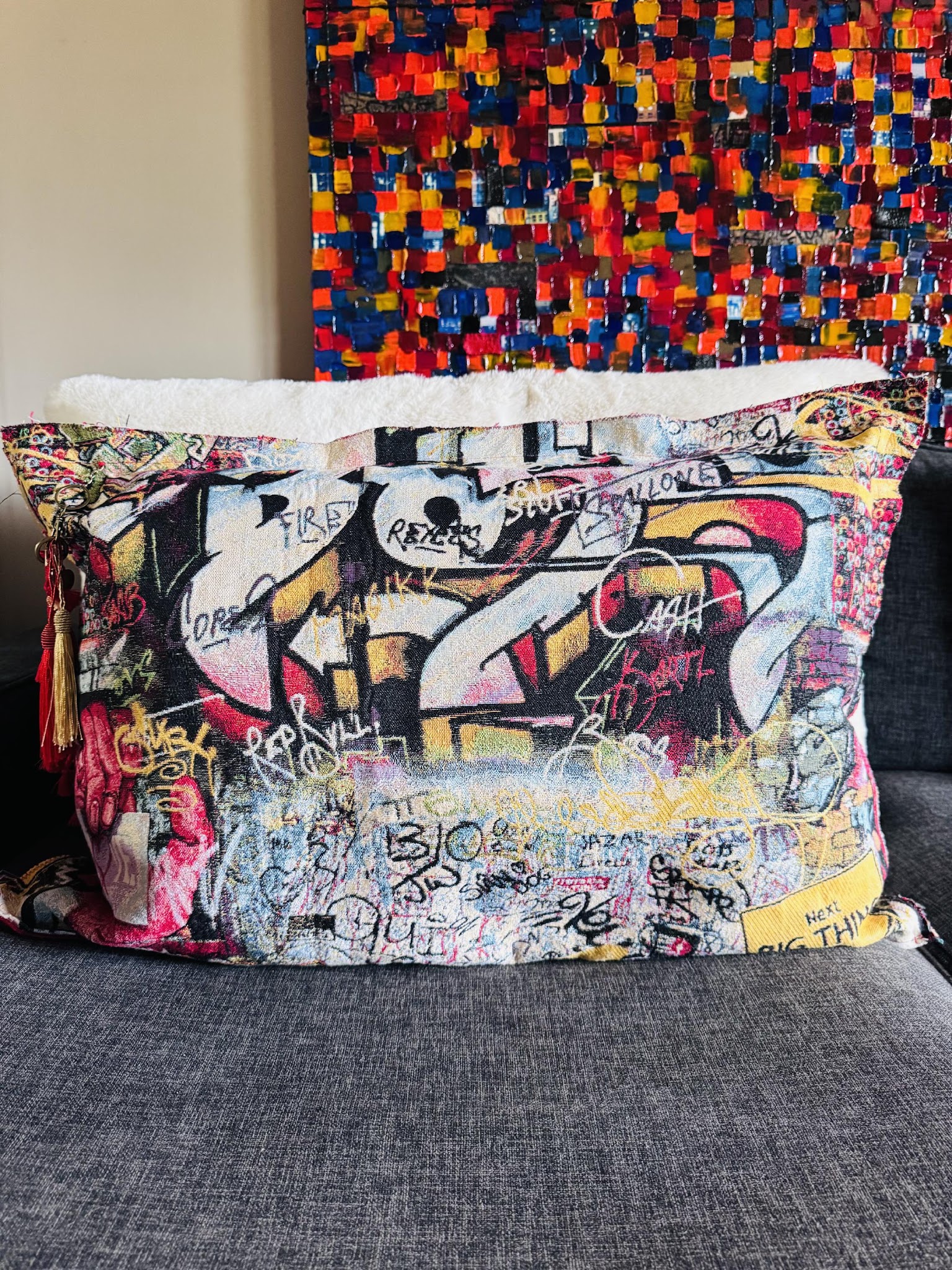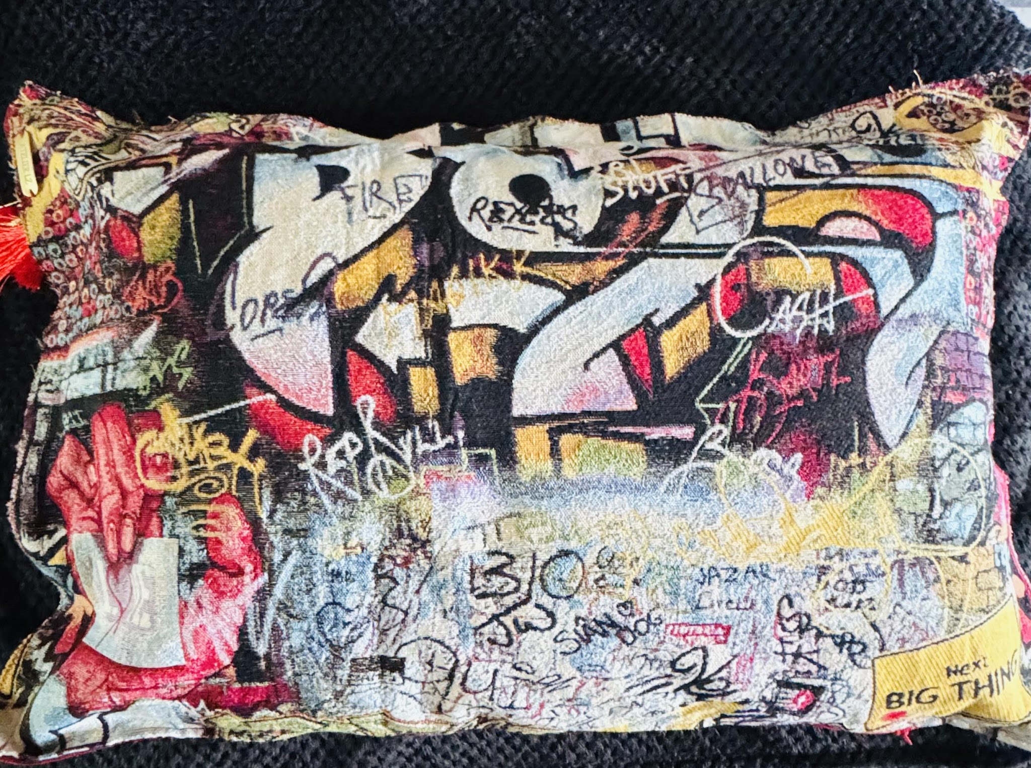 Ce coussin issu de la collection « Graffiti » a été imaginé pour s'intégrer avec harmonie dans votre intérieur, en parfait complément de la toile. Il est confectionné dans le tissu Jacquard utilisé pour la création de l’œuvre, proposé ici dans un format bi-matière original.