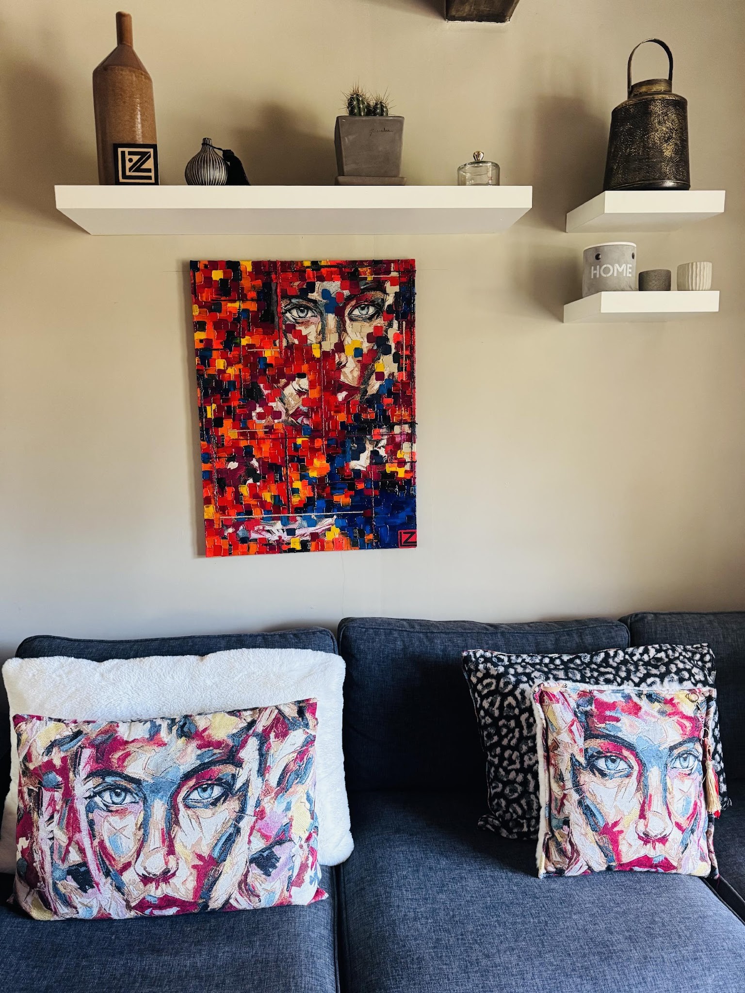 Ce coussin de la série « Reflet de l'âme » a été conçu comme une extension unique de la peinture. Il est réalisé avec le tissu Jacquard identique à celui utilisé sur la toile, assurant une continuité parfaite entre l'œuvre et l'objet.