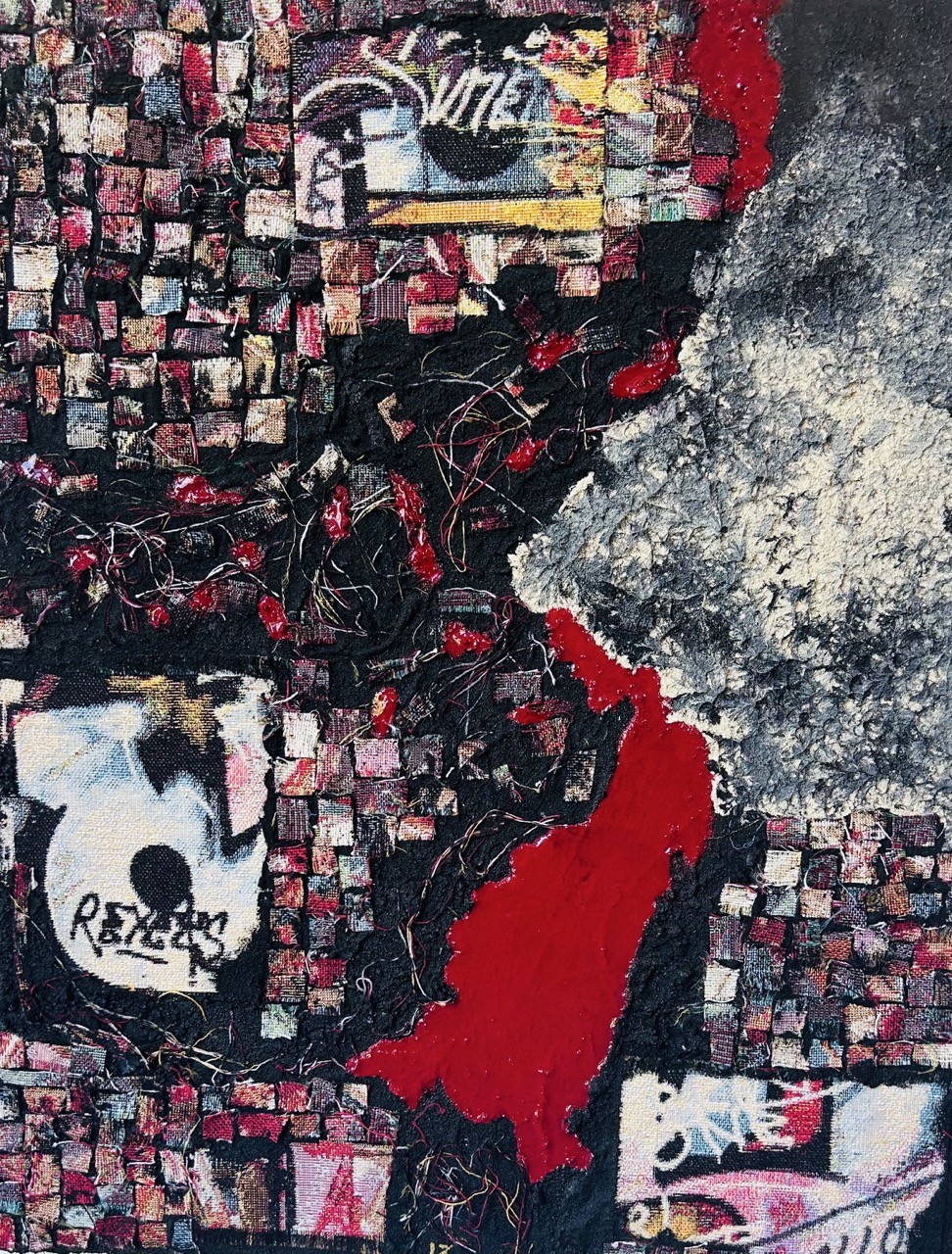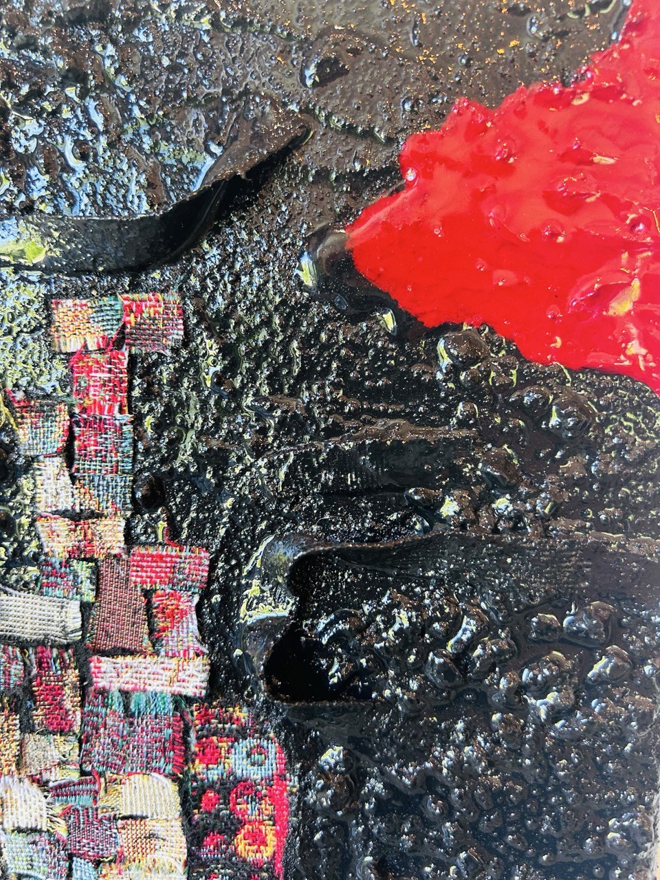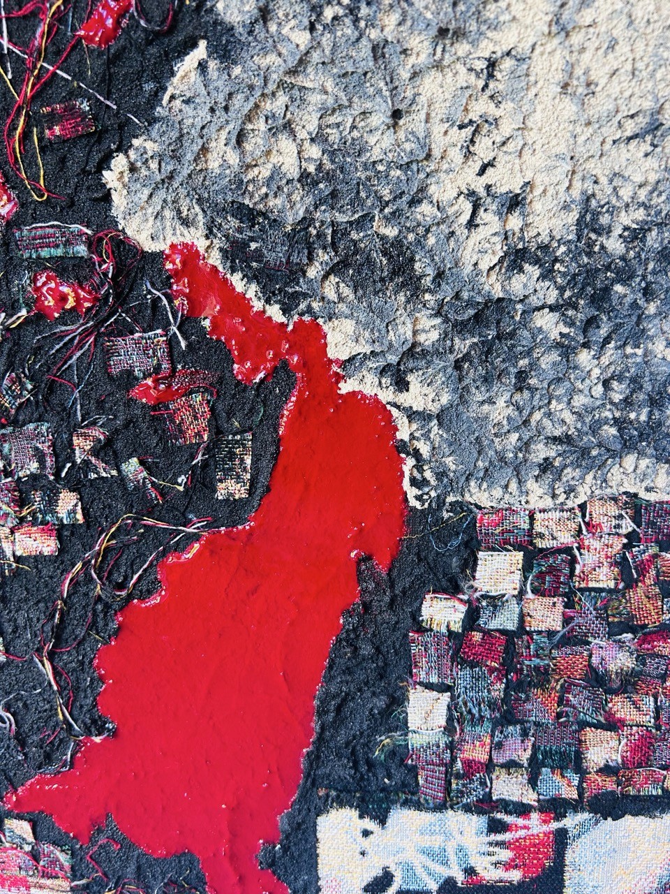Sur la première toile, les fragments s'assemblent avec précision, comme les pièces d'un puzzle. Chaque élément a trouvé sa place, dessinant une trajectoire reconstruite, programmée. Et pourtant, une fissure rouge fend la surface : c'est la faille qui reste, le souvenir d'un désordre ou d'un feu qui ne s'efface pas, ancrant l'œuvre dans le réel.