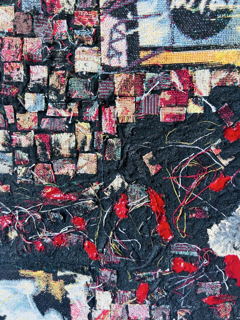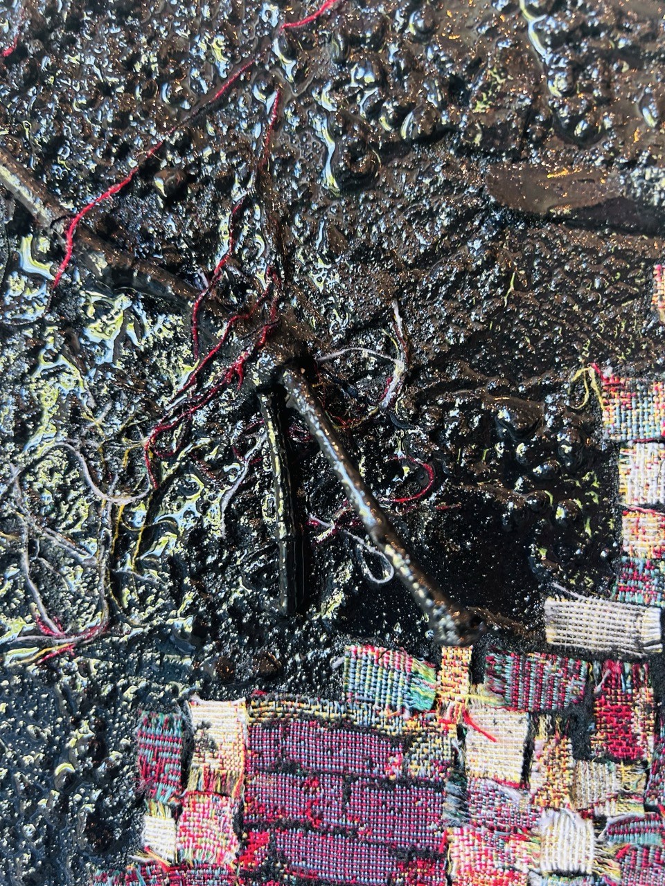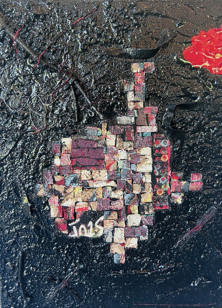 Sur la première toile, les fragments s'assemblent avec précision, comme les pièces d'un puzzle. Chaque élément a trouvé sa place, dessinant une trajectoire reconstruite, programmée. Et pourtant, une fissure rouge fend la surface : c'est la faille qui reste, le souvenir d'un désordre ou d'un feu qui ne s'efface pas, ancrant l'œuvre dans le réel.
