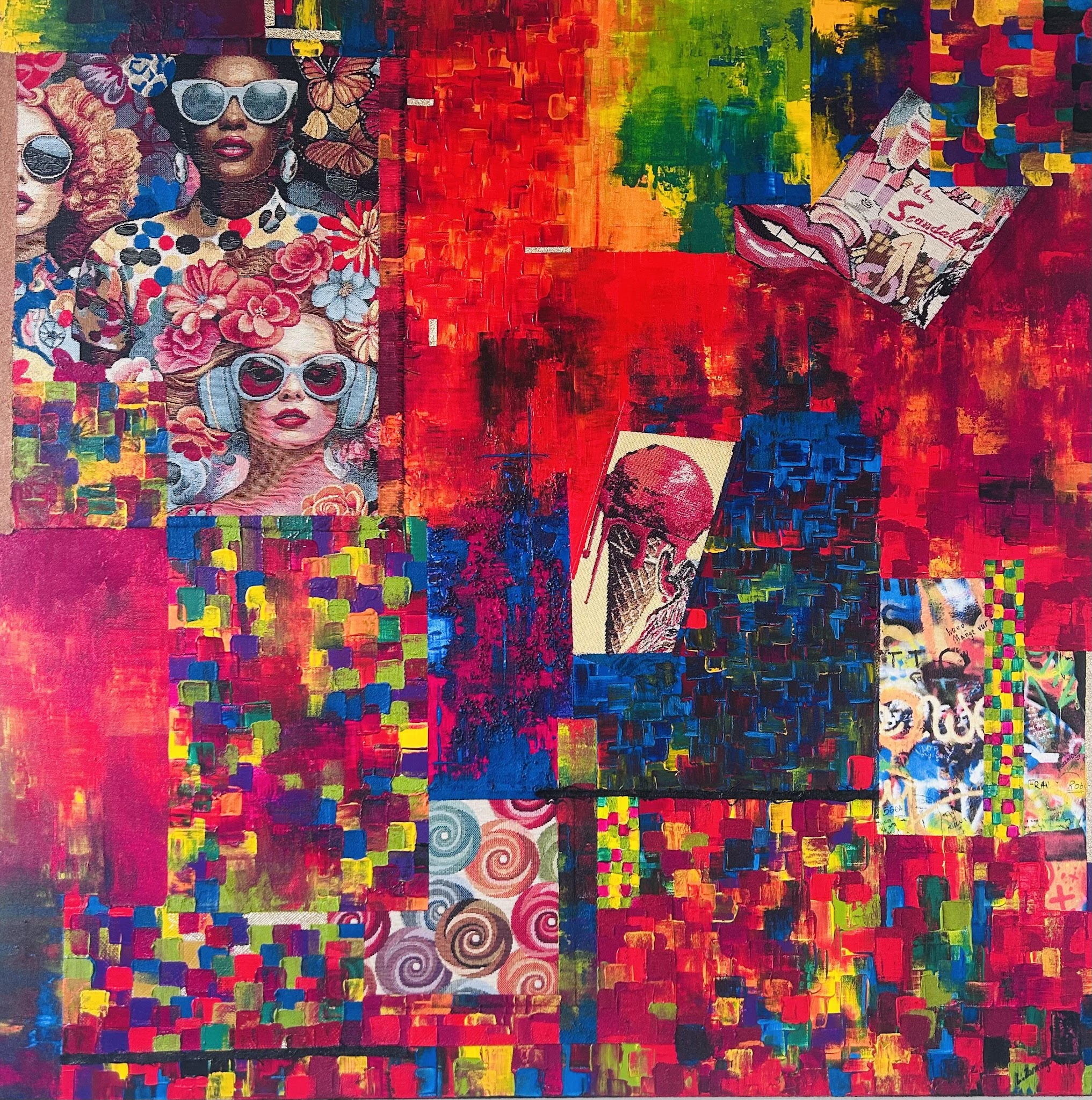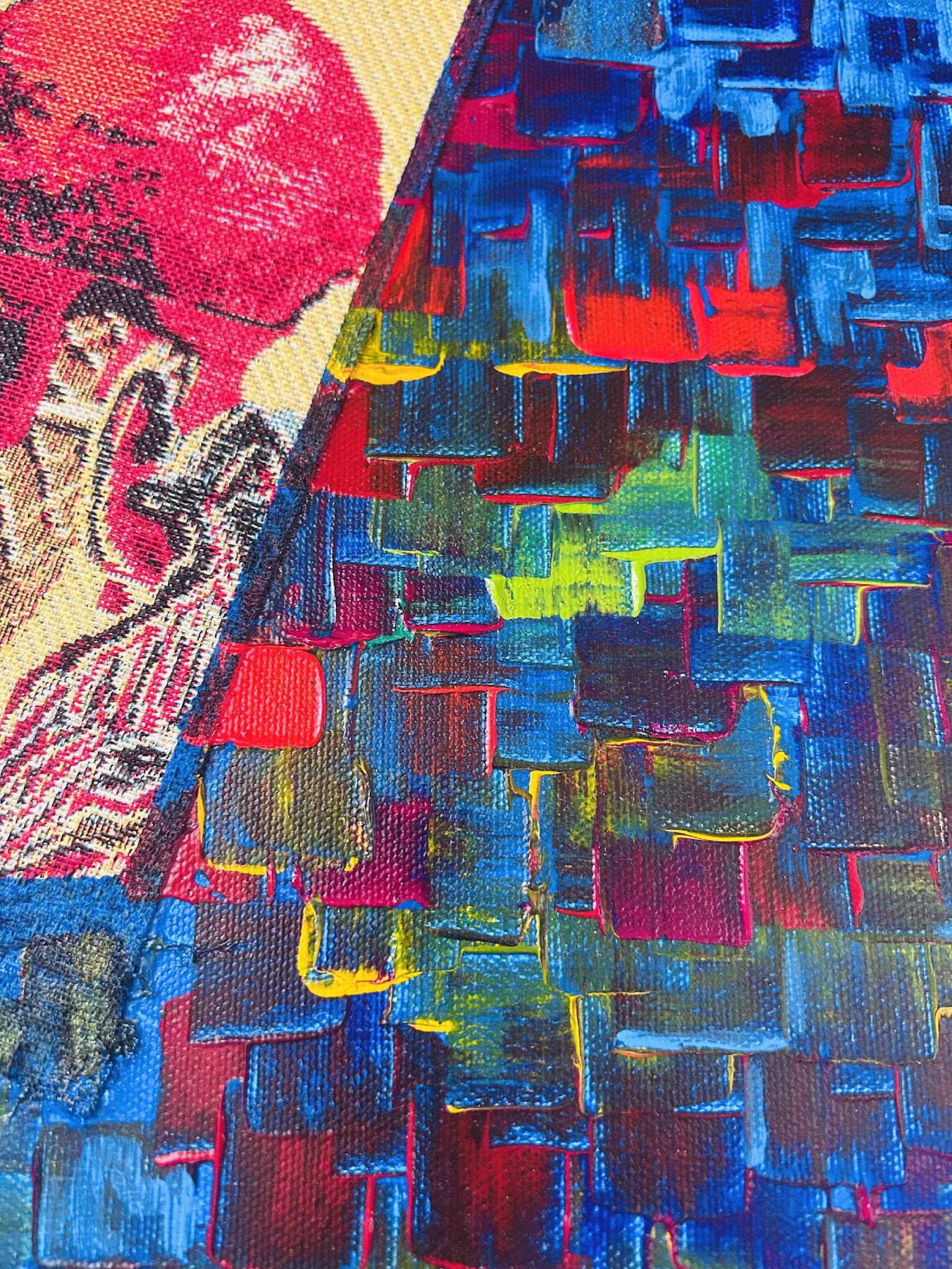Pièce monumentale de la série "Girl Power" (Format 200x100 cm). Ce diptyque puissant célèbre la force féminine et la liberté reconquise. La texture du sable et du tissu donne vie aux visages, tandis que les couleurs vibrantes diffusent une énergie positive. Finition vernis brillant pour protéger et sublimer les éclats. Œuvre unique, signée et contresignée. Ce diptyque peut être exposé seul ou en constellation avec d'autres œuvres de la série.