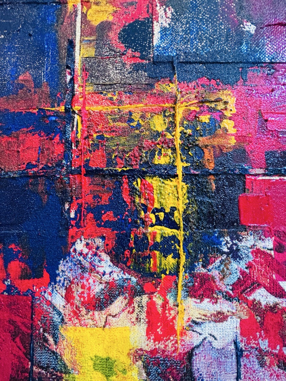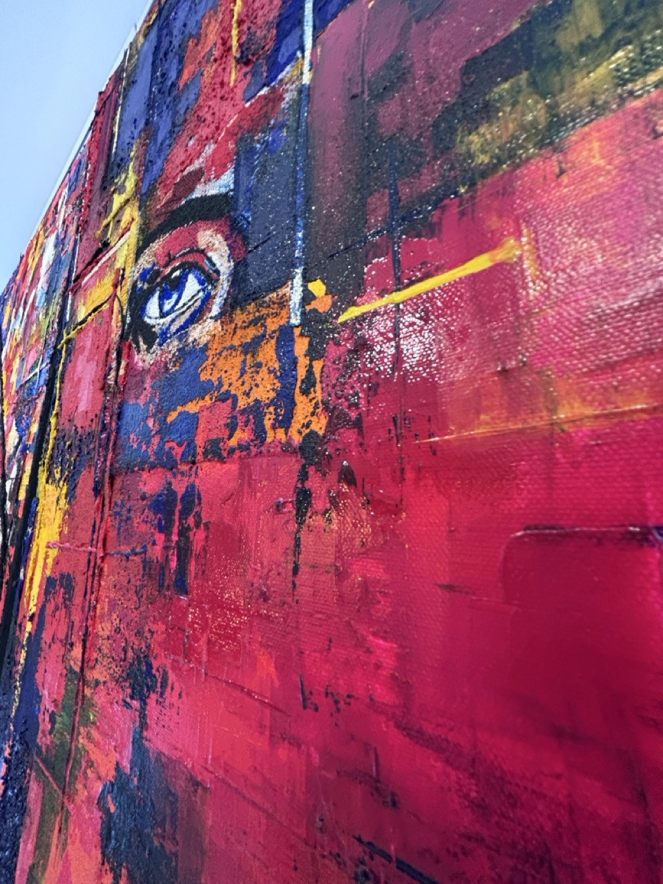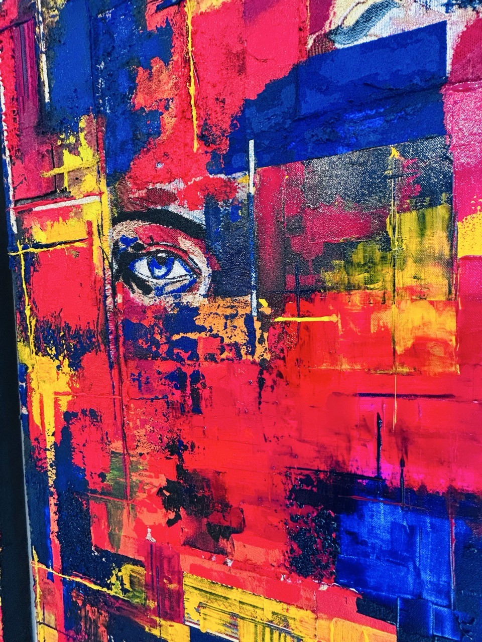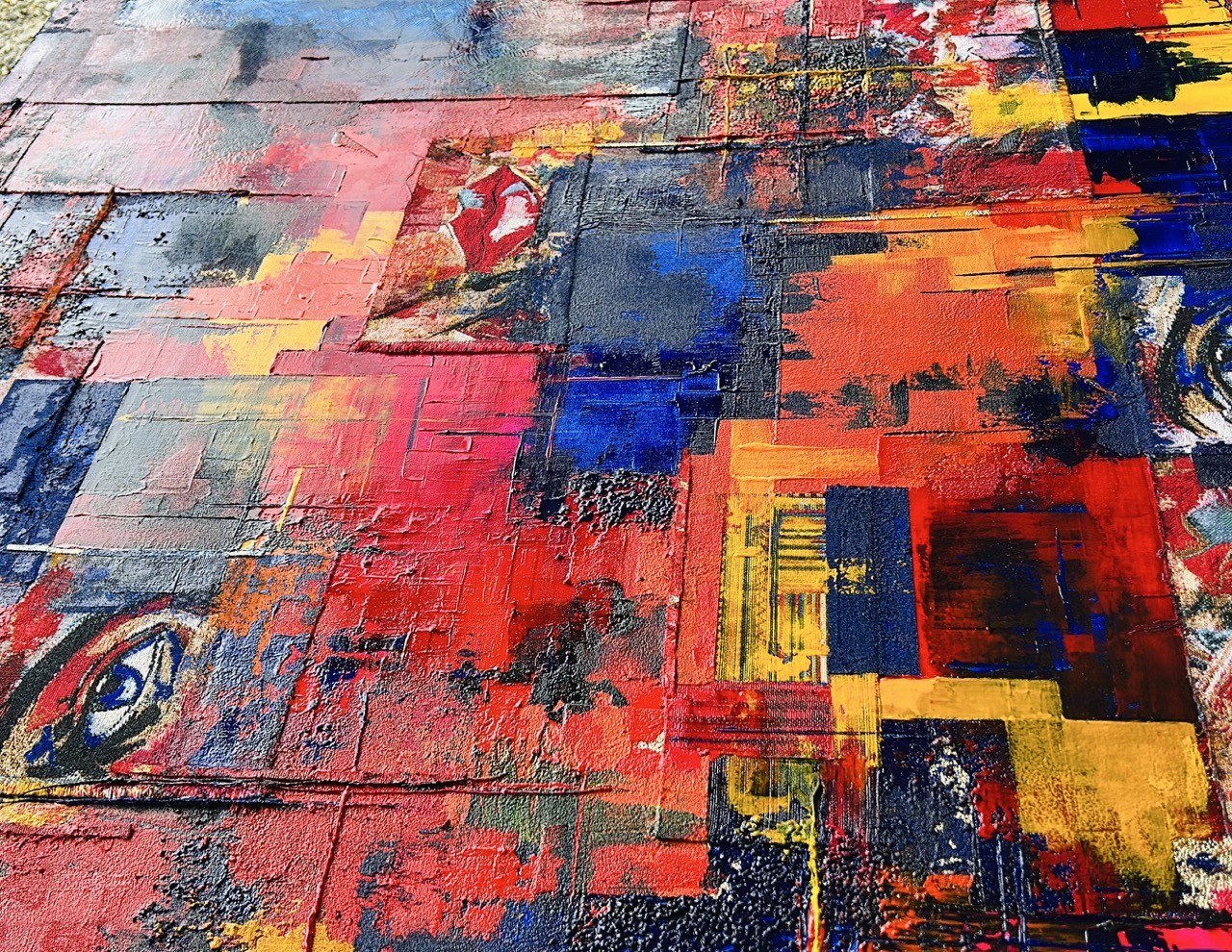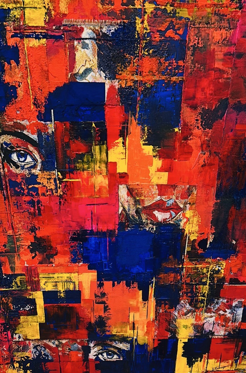 La palette chromatique est une véritable déflagration d’énergie. Le rouge dominant, ardent et viscéral, évoque le bouillonnement des émotions et la passion vitale. Il entre en collision avec des zones de bleu profond — couleur de l'inconscient et du mystère — et des éclats de jaune lumineux qui agissent comme des fulgurances, des instants de lucidité au milieu du chaos psychique.