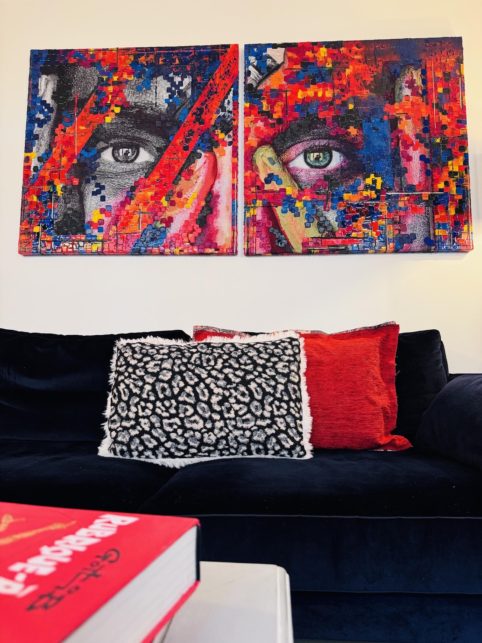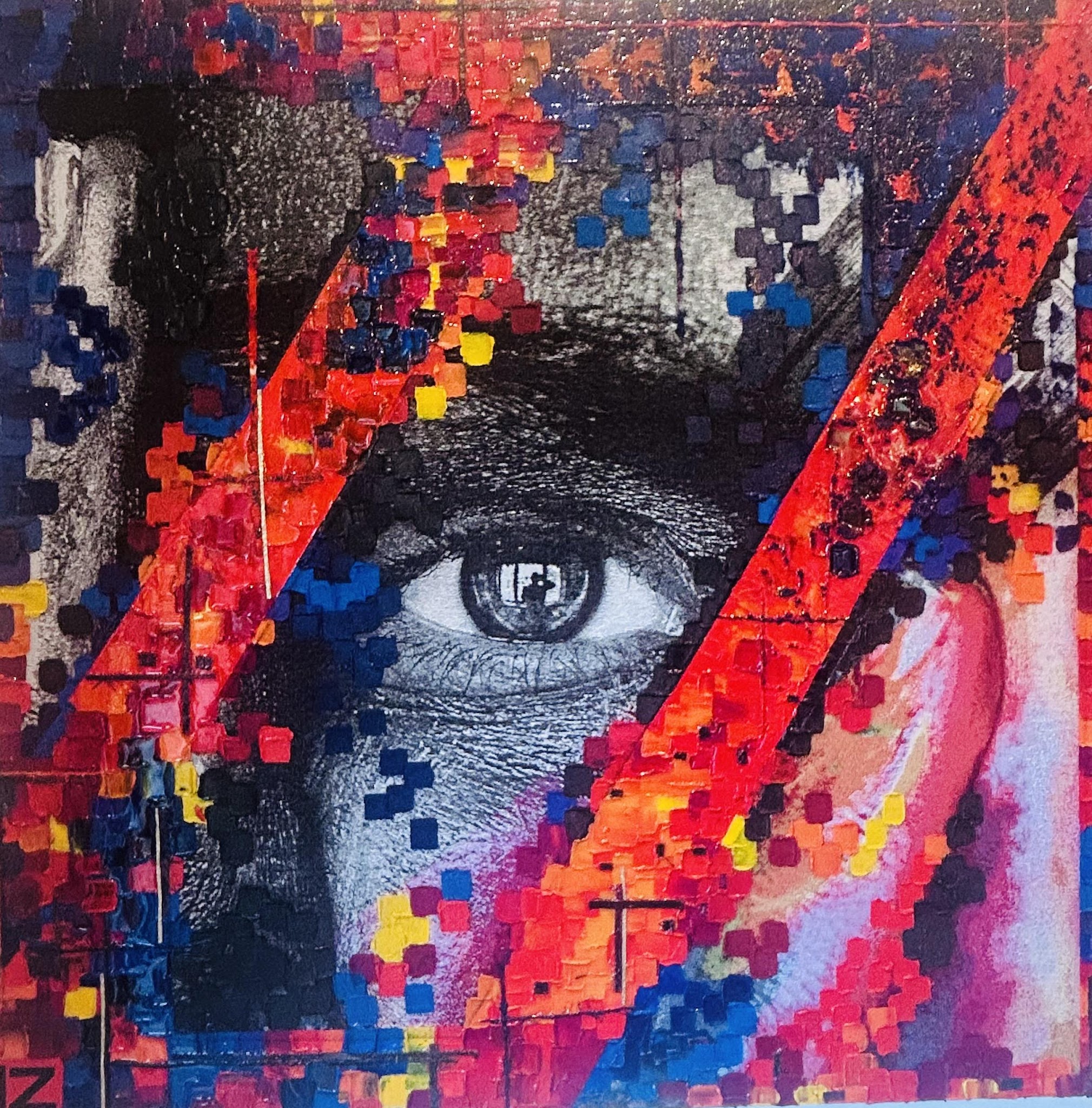 Deux visages, un seul regard... La vision de l’un dans le regard de l’autre. Le regard se construit dans la tension, dans la superposition des émotions et des histoires. L’œil masculin n’observe pas seul. Il est regardé. L’œil féminin n’est pas seulement vu : il renvoie, interroge, résiste. Entre les deux panneaux, il n’y a pas de frontière nette, mais un espace invisible: celui de la relation. Un espace òu les identités se déplacent, se répondent , se modifient. Le regard de l’un devient le miroir de l’autre, parfois le refuge, parfois confrontation. Cette œuvre parle d’unité, de respect de résonance. Regarder ici, c’est déjà etre regardé. Entre jugement et bienveillance, ce regard interroge notre propre reflet et ce que nous projetons sur le monde extérieur.