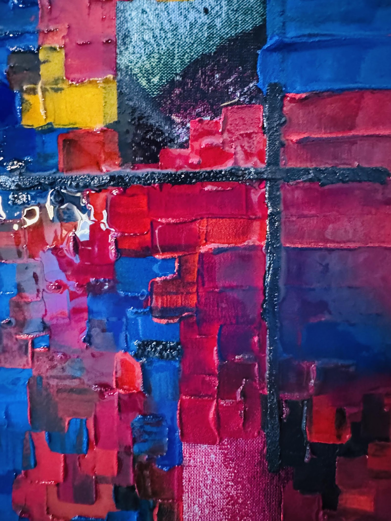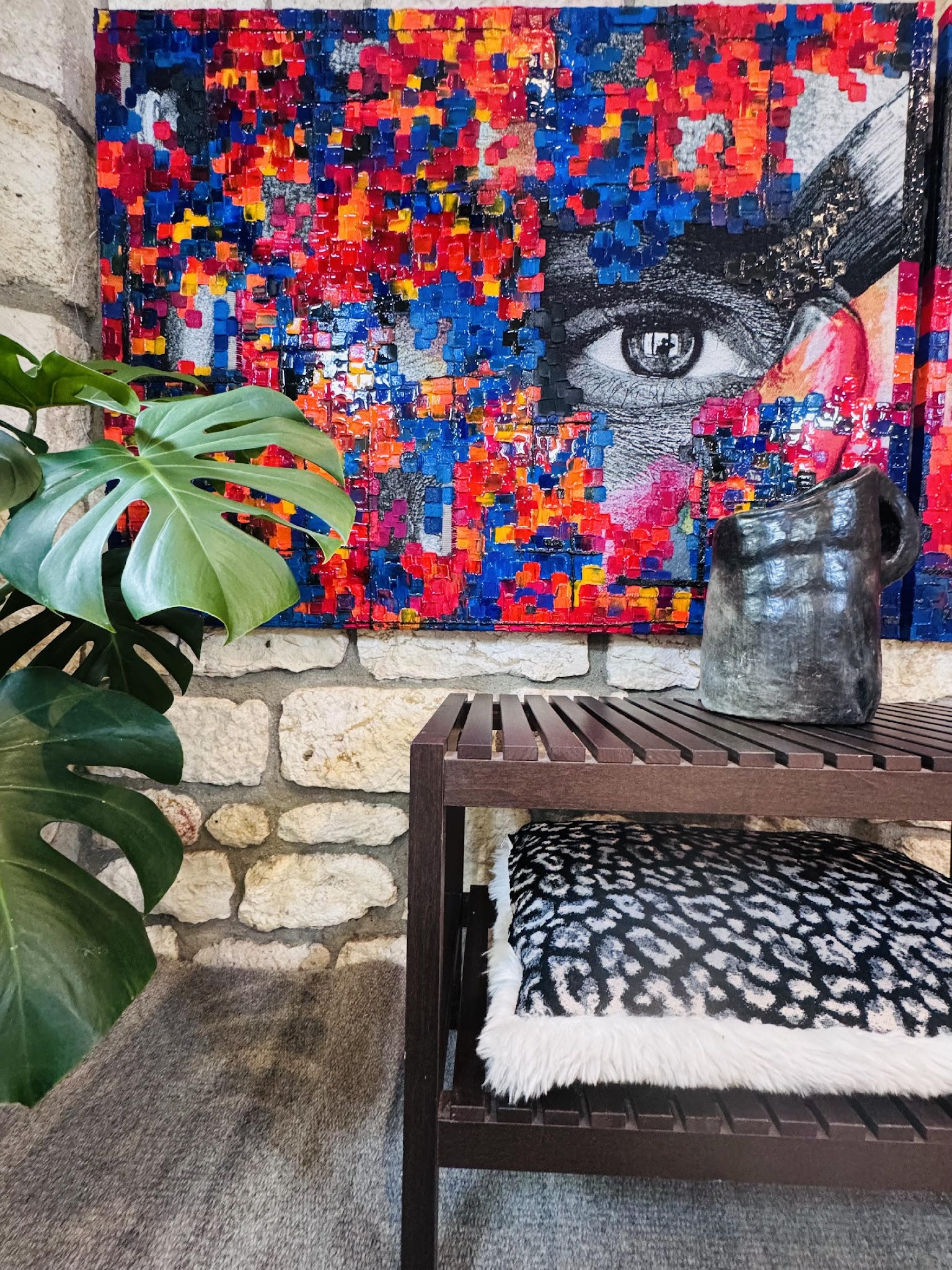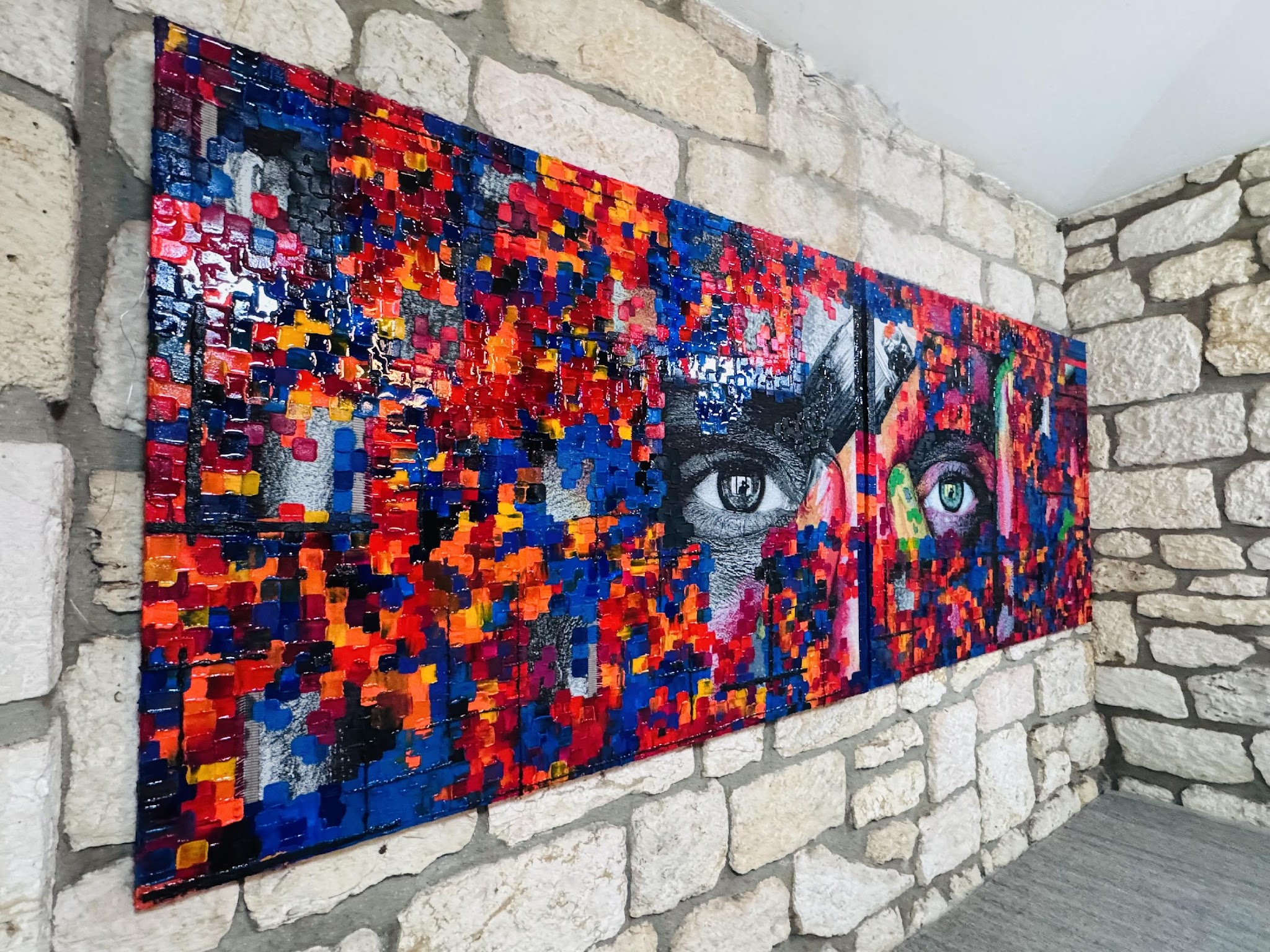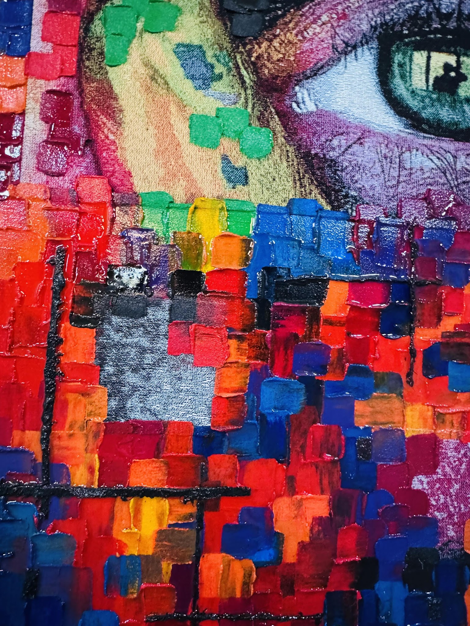 Ce n'est pas simplement un œil peint, c'est deux regards avec une même direction. Chaque oeil porte la traçe de l’autre, comme si le regard ne pouvait exister qu’ en étant réfléchi, déplacé, fragmenté par l’autre présence. On retrouve cette décomposition dans la peinture reliée par les pixels partout sur la toile. Un chaos de couleurs mélangées mais qui dans leur ensemble dessine une unité.