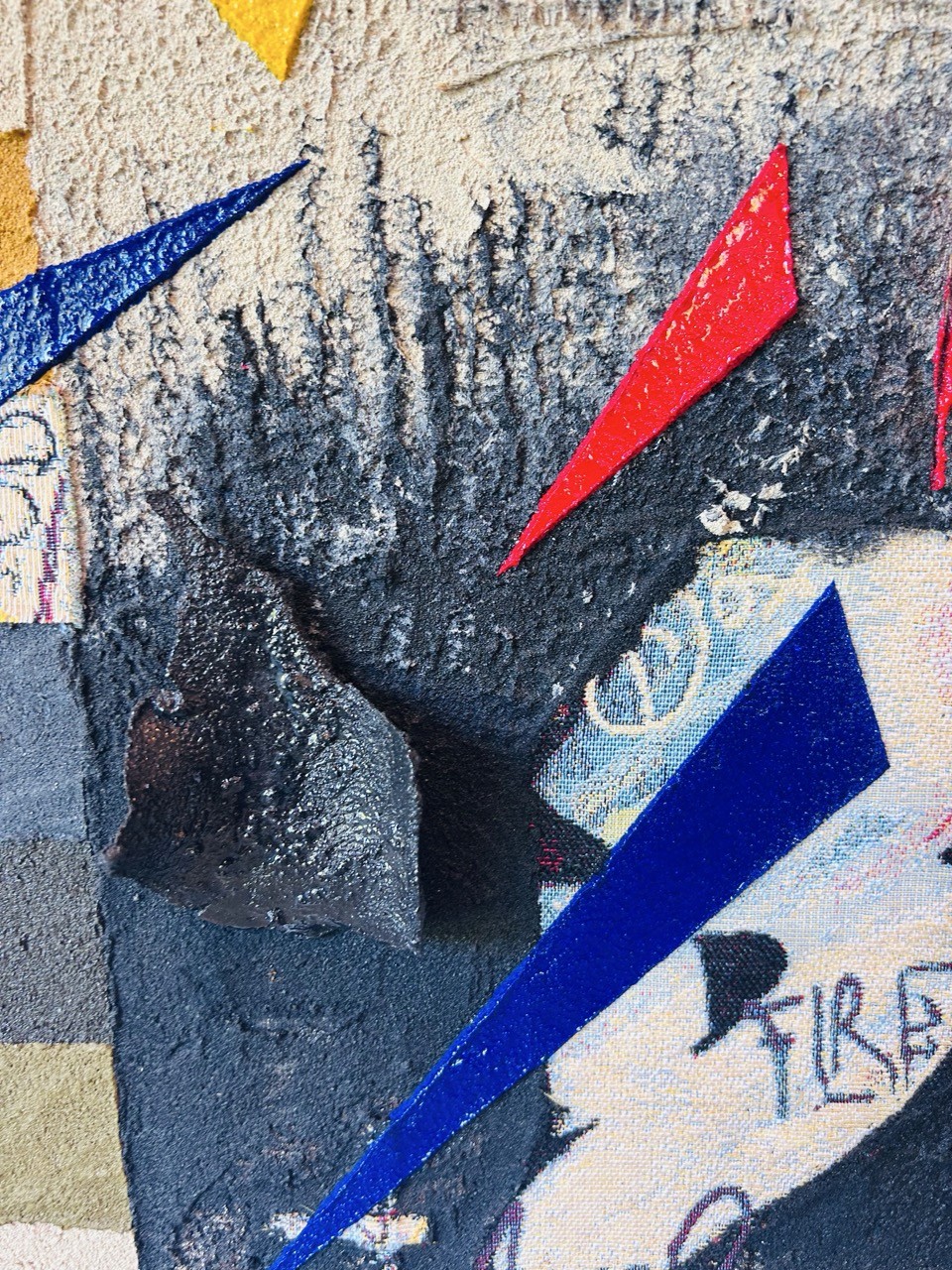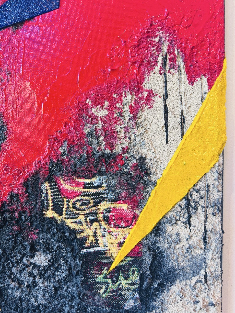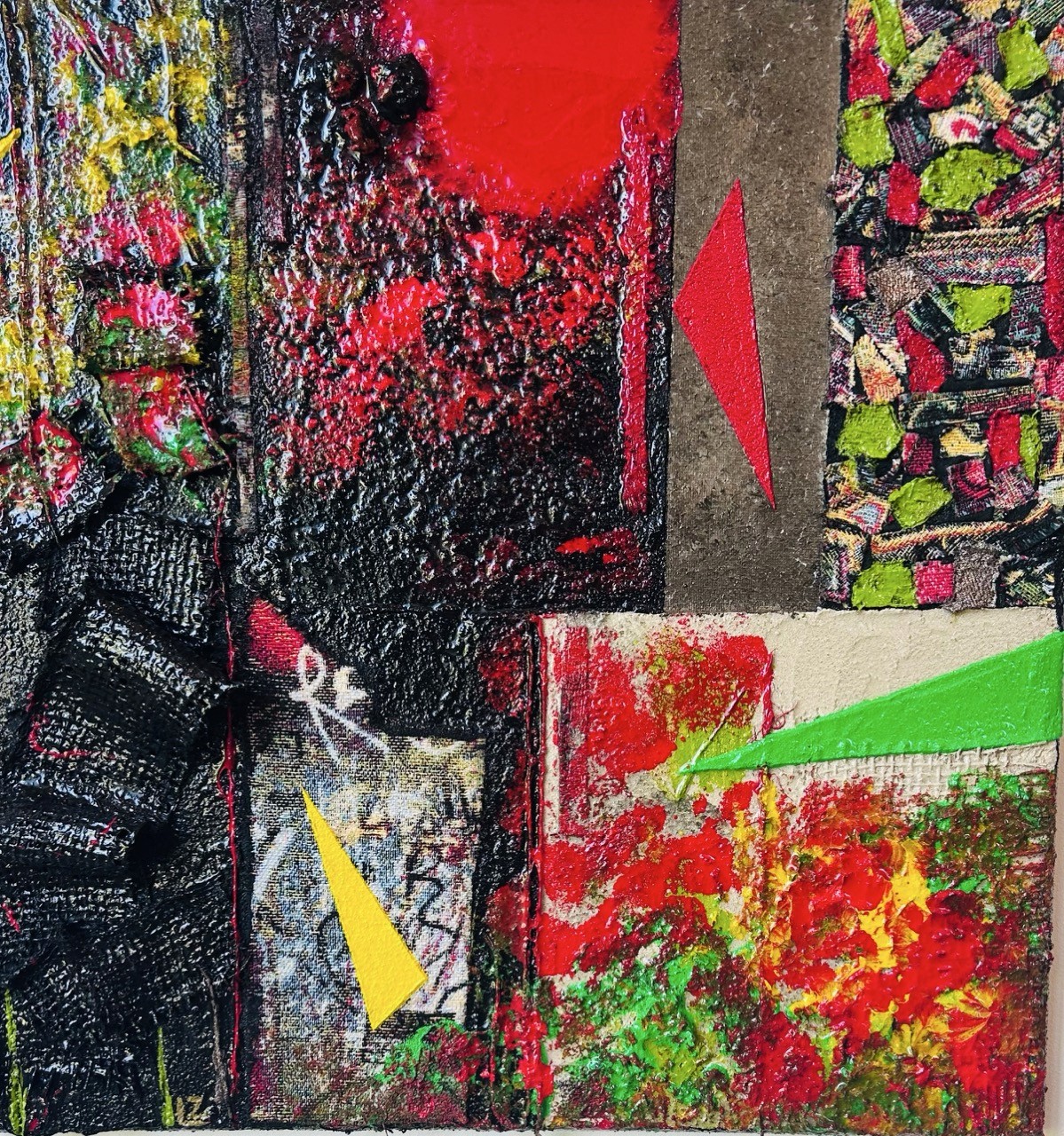 Les formes s'entrechoquent, s'opposent, se répondent dans une composition éclatée, presque musicale. Rouge, noir, bleu, jaune : les couleurs explosent. Elles saturent l'espace, absorbent le regard, créent des tensions vibrantes entre l'ordre apparent et le chaos intérieur.