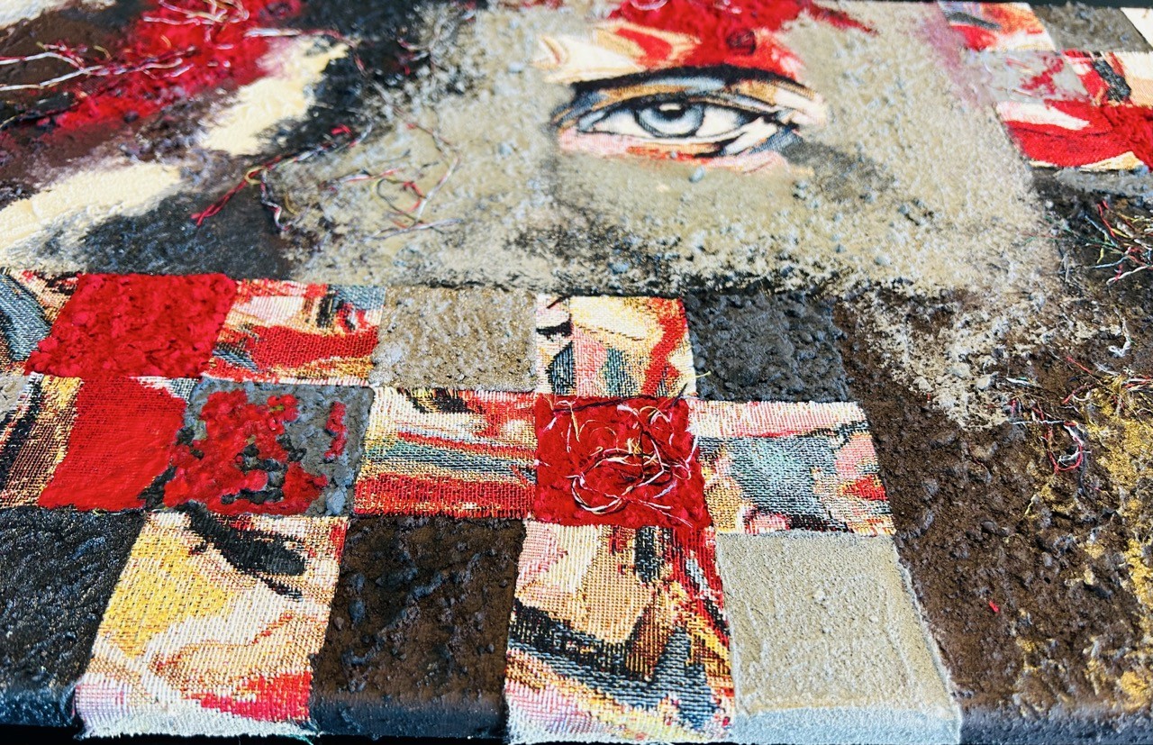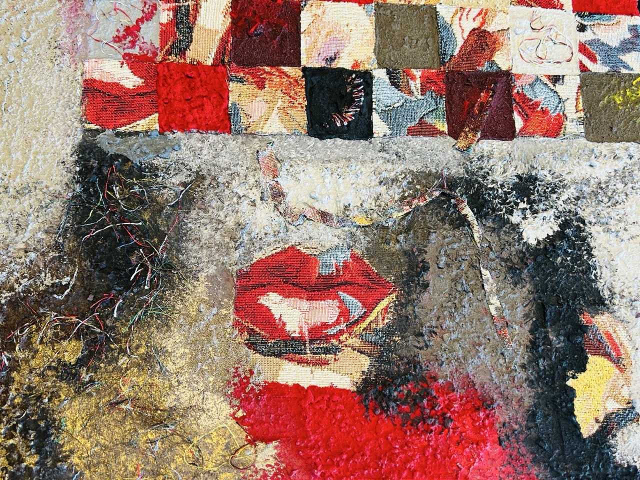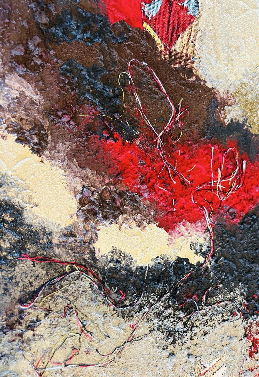 La matière rugueuse du sable donne à la toile une texture presque minérale, incarnant la résistance du vécu, les traces laissées par le temps.