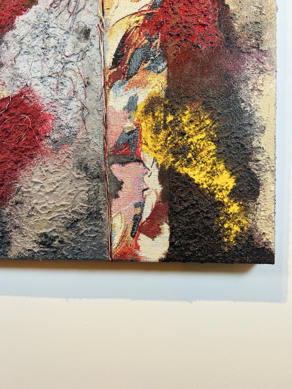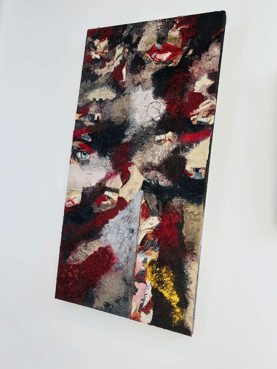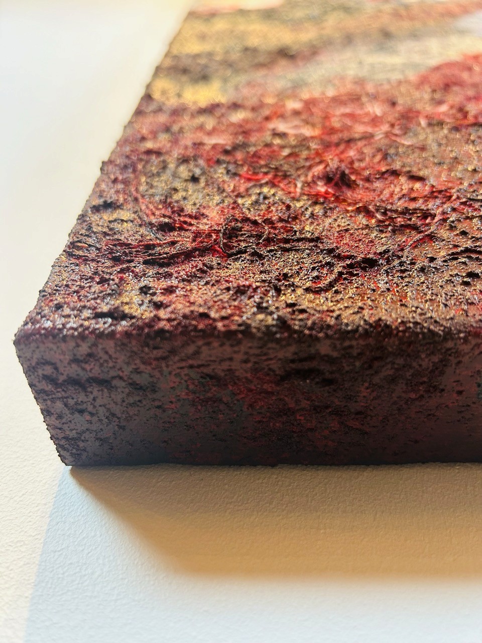 La rugosité du sable donne à la surface une texture brute, presque archaïque. Elle évoque une âme faite de strates, de résistances, de silence accumulé. Rien n'explose ici : tout vibre à l'intérieur, dans la retenue, dans le non-dit. L'œuvre ne montre pas l'âme, elle la fait ressentir — lourde, vivante, multiple.