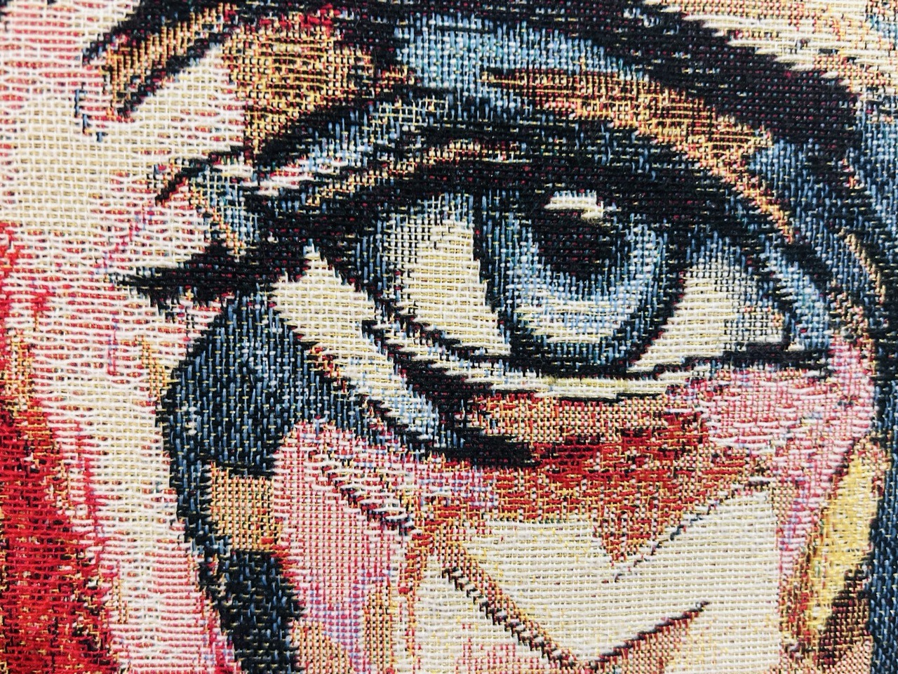 Réalisé en jacquard, une étoffe à la fois élégante et souple, il donne vie à un visage symbolique. Des yeux qui fixent, une bouche silencieuse — autant de signes qui invitent à la contemplation et à l’introspection. Les codes du thème s’y inscrivent avec force : le regard, la présence, l’âme mise en lumière.