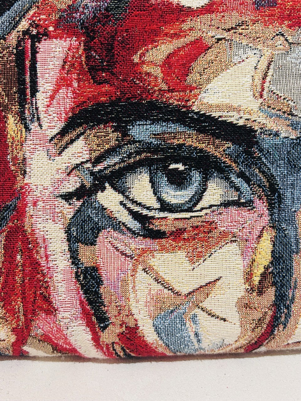 Réalisé en jacquard, une étoffe à la fois élégante et souple, il donne vie à un visage symbolique. Des yeux qui fixent, une bouche silencieuse — autant de signes qui invitent à la contemplation et à l’introspection. Les codes du thème s’y inscrivent avec force : le regard, la présence, l’âme mise en lumière.