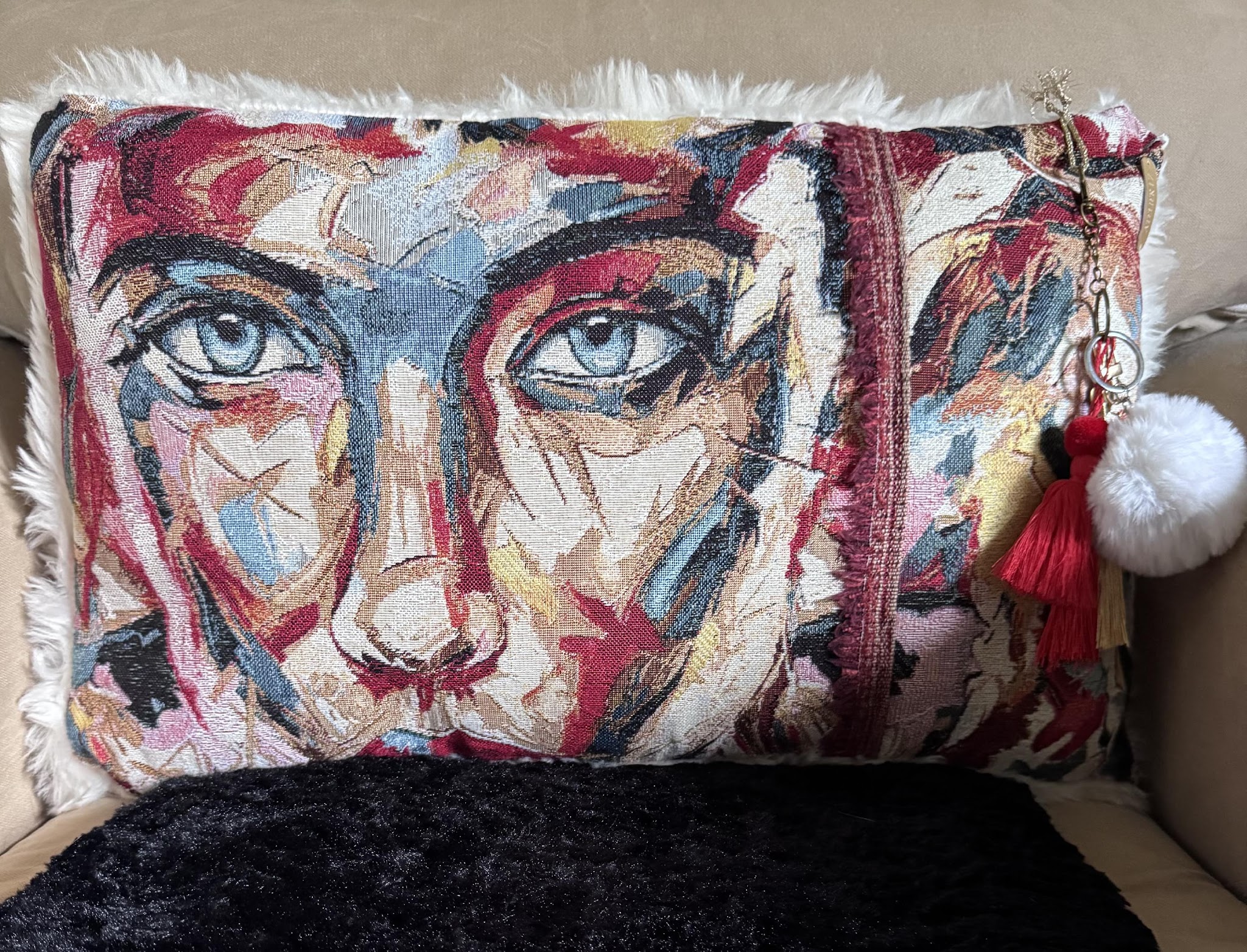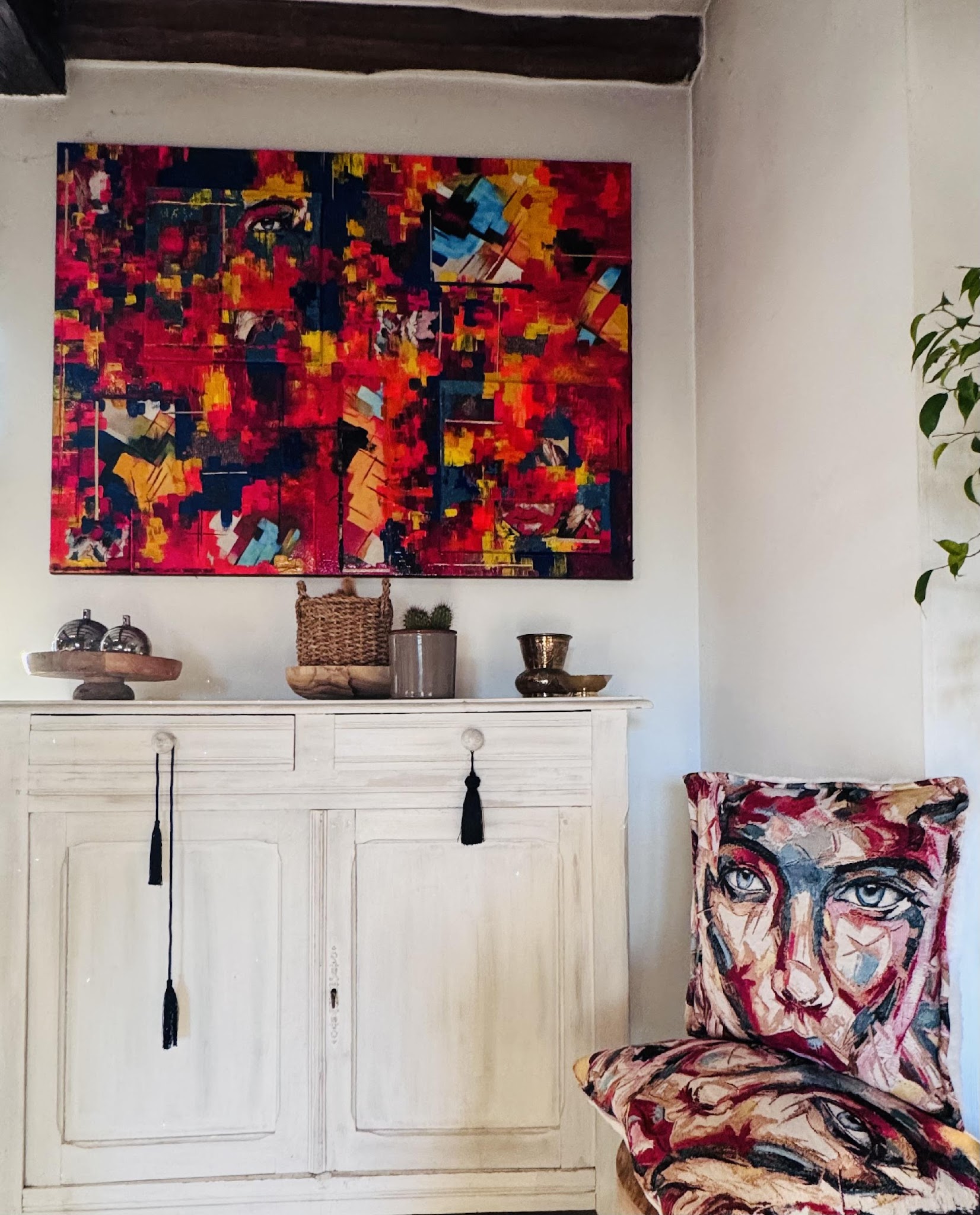 Œuvre originale de grand format réalisée en technique mixte, mêlant peinture acrylique, sable et tissu pour une texture riche.