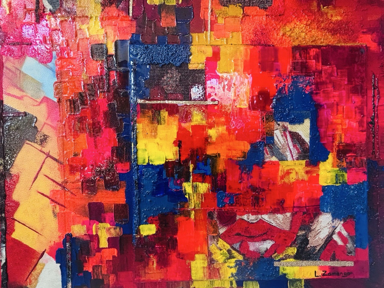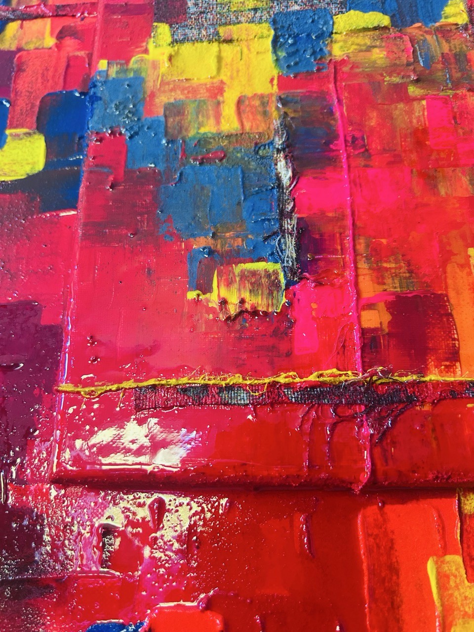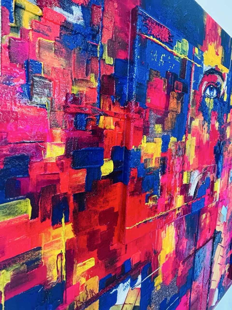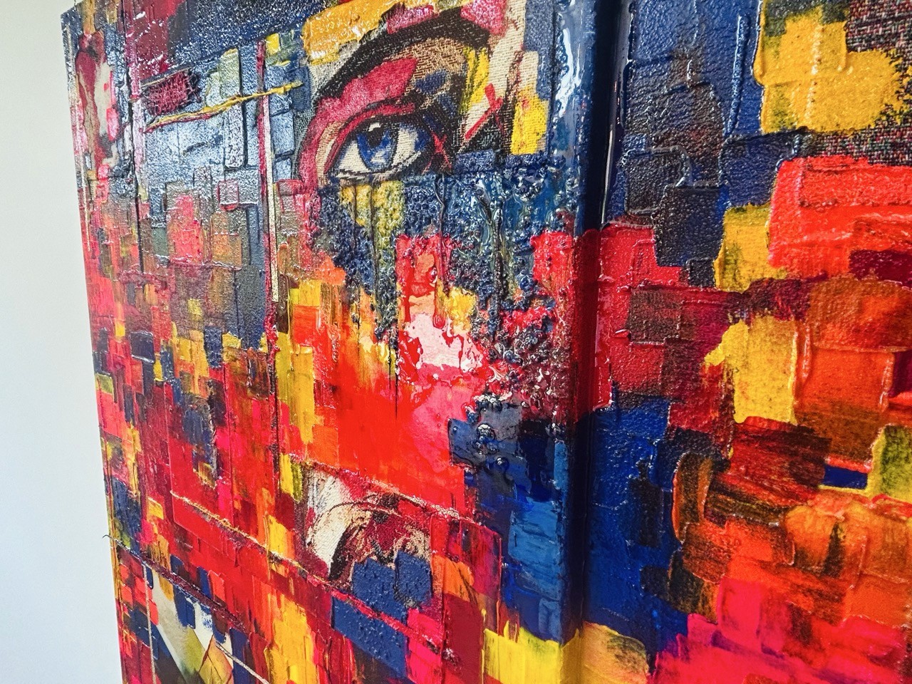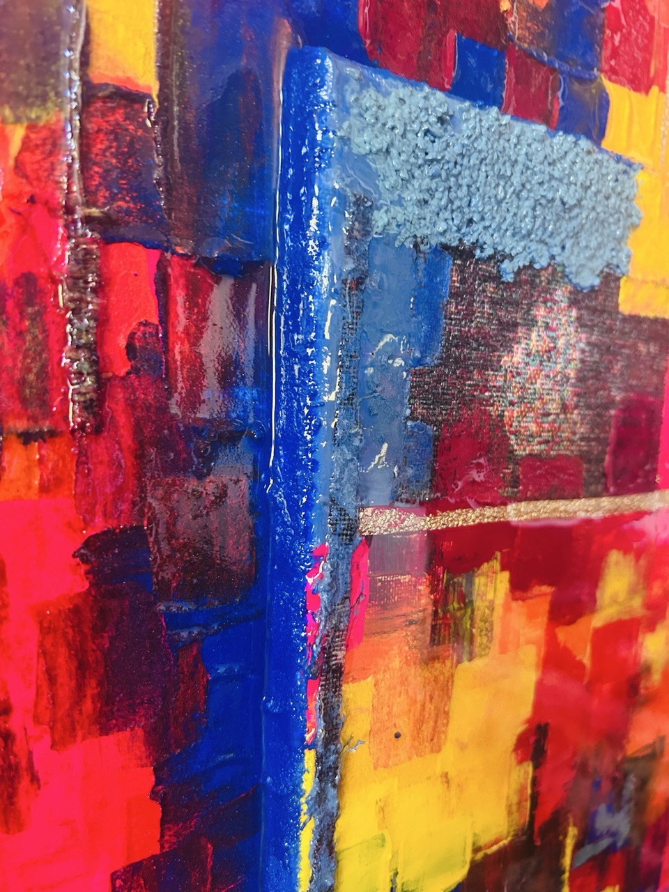 Cette composition unique se distingue par son relief, créé par la superposition de deux toiles de 39x39 cm sur le format principal. L'ensemble est sublimé par une finition à la résine étalée au pinceau, apportant brillance et profondeur.