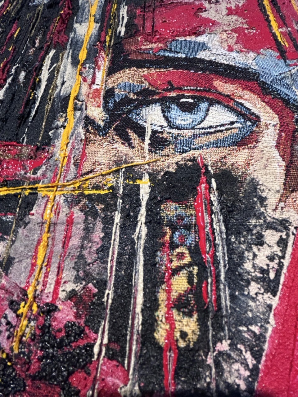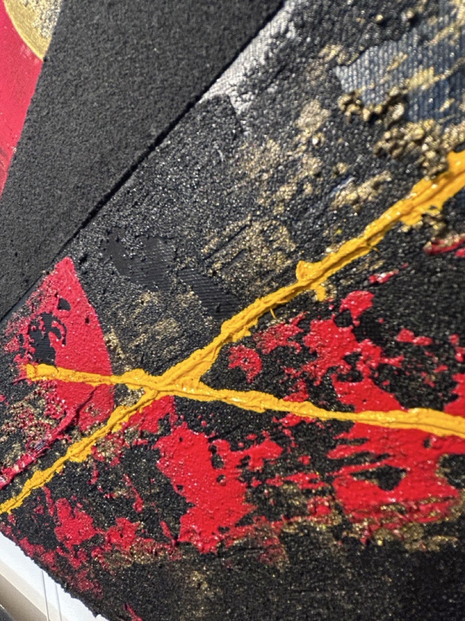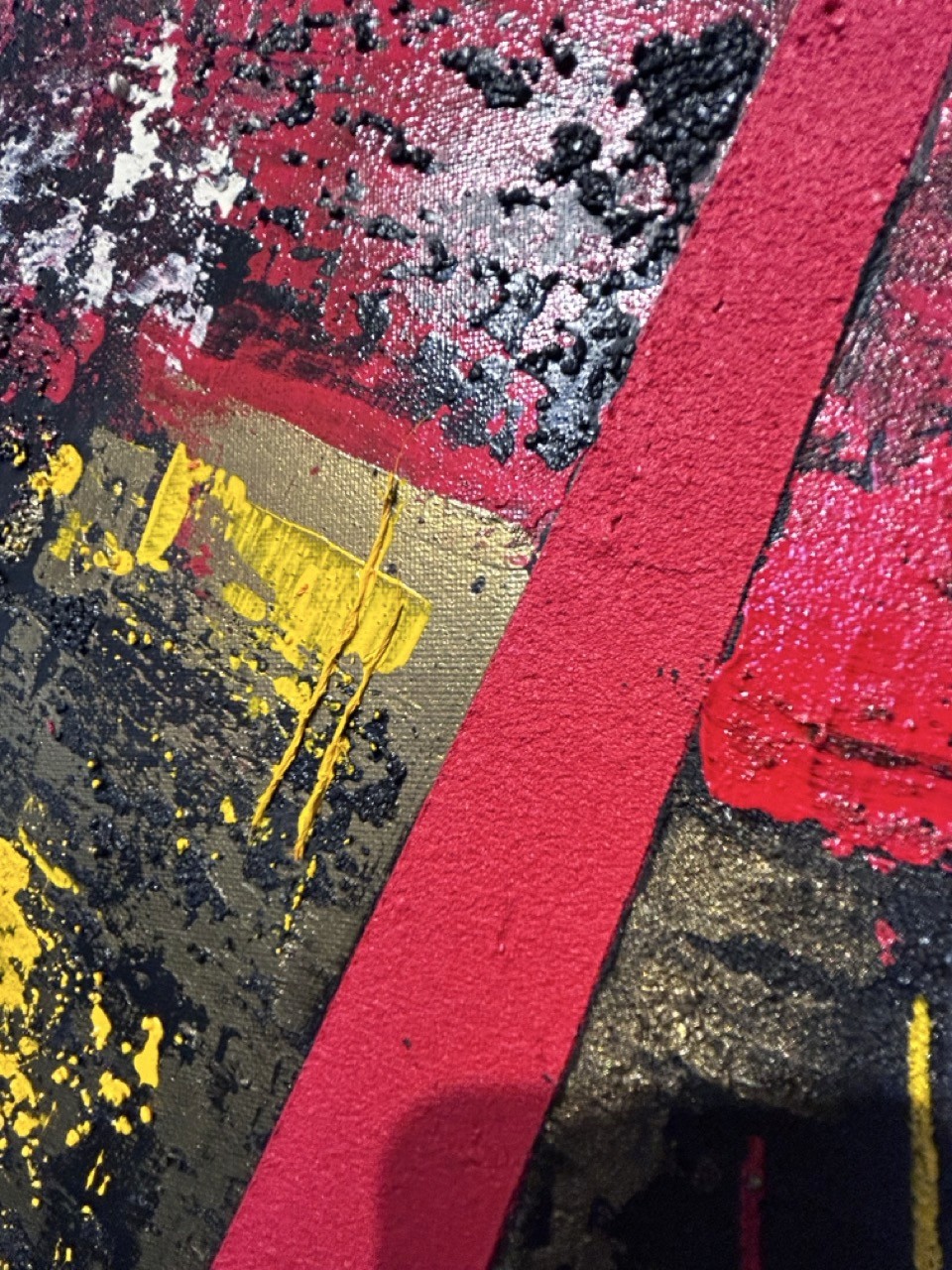Les couleurs dominantes — doré, noir et rouge — créent une atmosphère à la fois noble, dramatique et incandescente. Le doré évoque une lumière intérieure, un éclat d'espoir ou de transcendance. Le noir, lui, renvoie à l'ombre, au doute, à l'inconnu. Quant au rouge, il pulse comme un cœur battant, chargé de passion, de douleur ou d'énergie vitale. Ces teintes expriment ensemble une intensité émotionnelle profonde, à la fois spirituelle et charnelle.