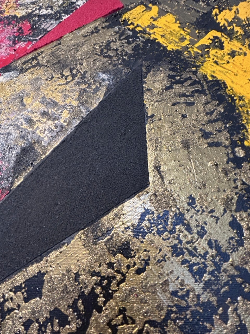 Des triangles apparaissent comme des symboles : formes précises au sein du chaos, ils peuvent représenter des tensions, des directions, des choix. Ils inscrivent sur la toile une géométrie du conflit ou de l'élévation, selon l'angle du regard.
