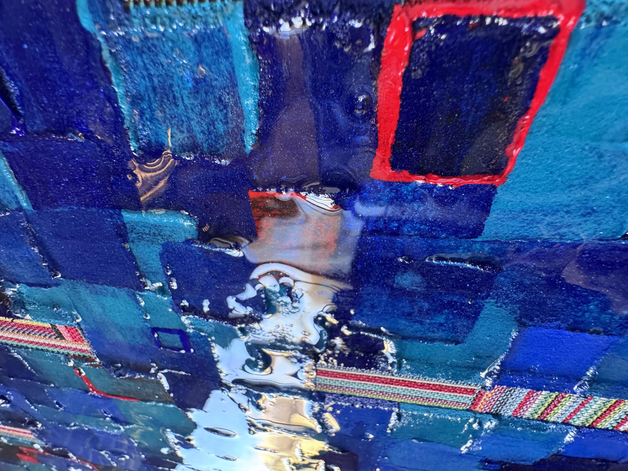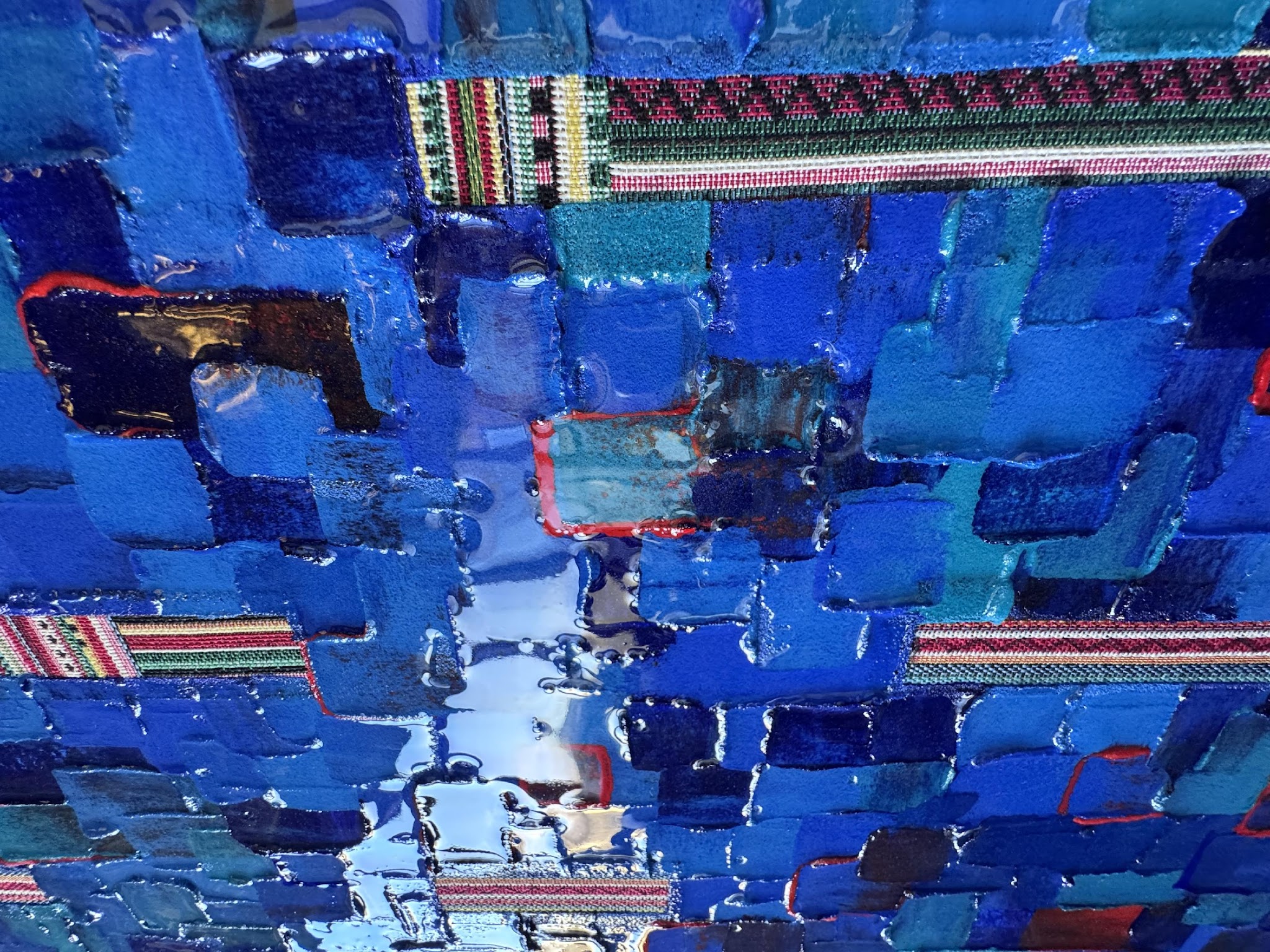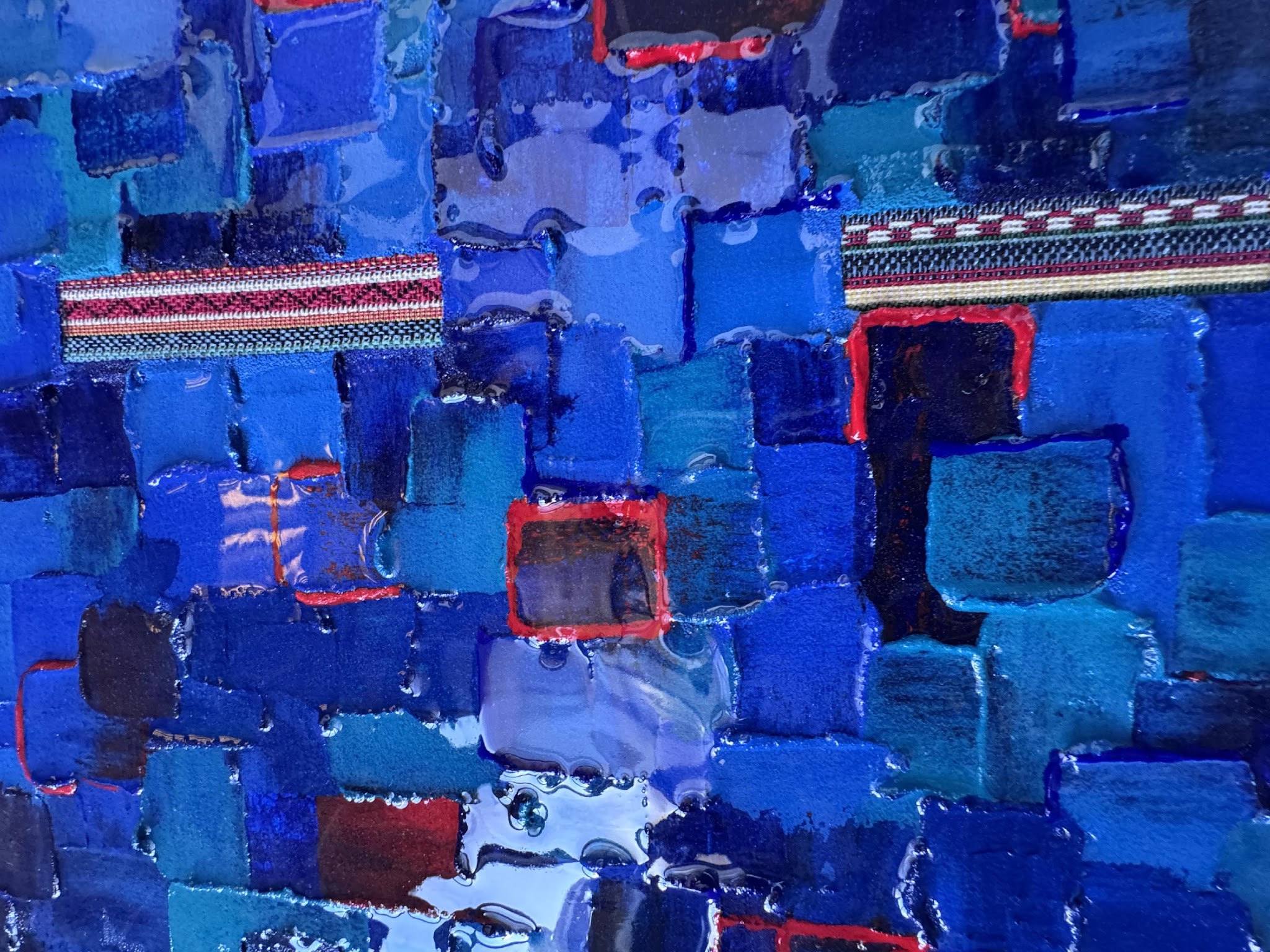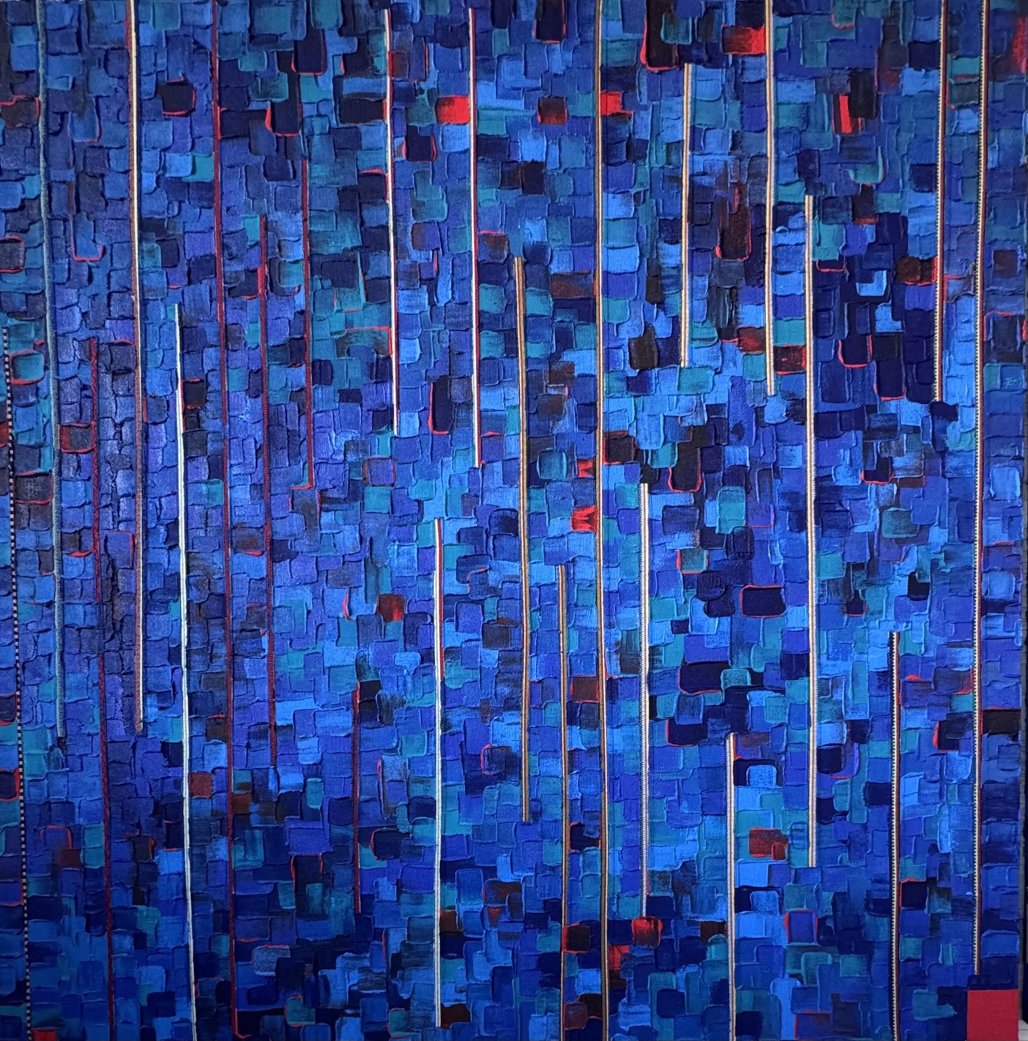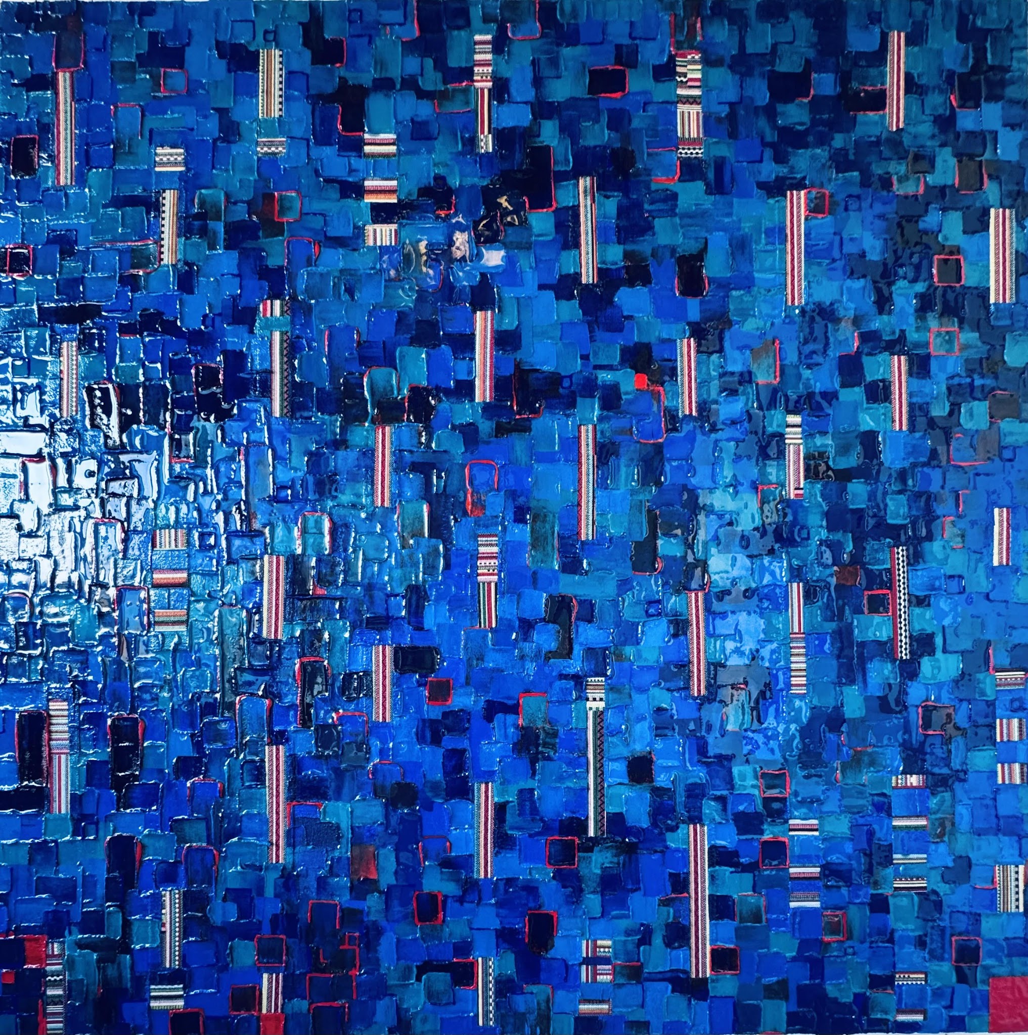 Le bleu y domine comme une matière mentale : il n’est pas décoratif, il est un espace profond à traverser. Des éclats rouges ponctuent la composition, tels des repères fragiles, des battements de cœur ou des accidents de mémoire. « Territoire » est une invitation à la lecture lente, à la dérive du regard et à l’exploration d’une cartographie qui ne se livre jamais entièrement.