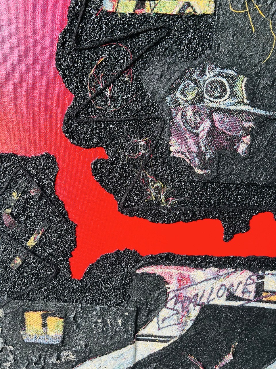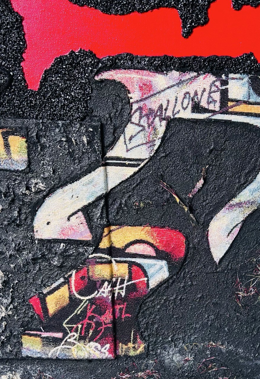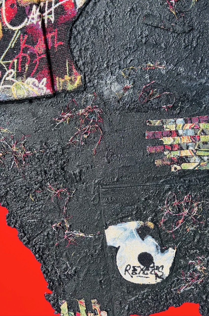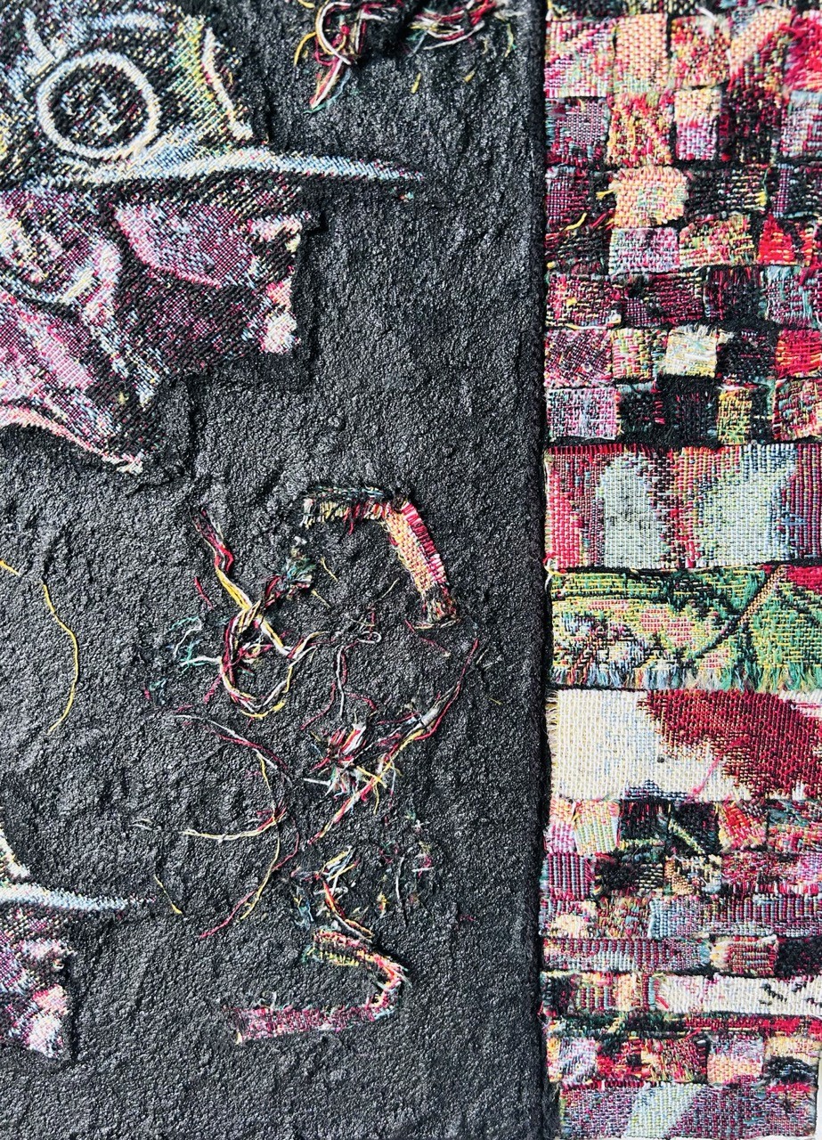 Au centre, deux fragments de tissu, éloignés mais destinés à se rejoindre, apparaissent comme les pièces d'une histoire encore inachevée, symboles d'une âme en quête de son unité. Une coulée rouge traverse discrètement la composition, témoignant des blessures et des cicatrices qui jalonnent ce chemin.
