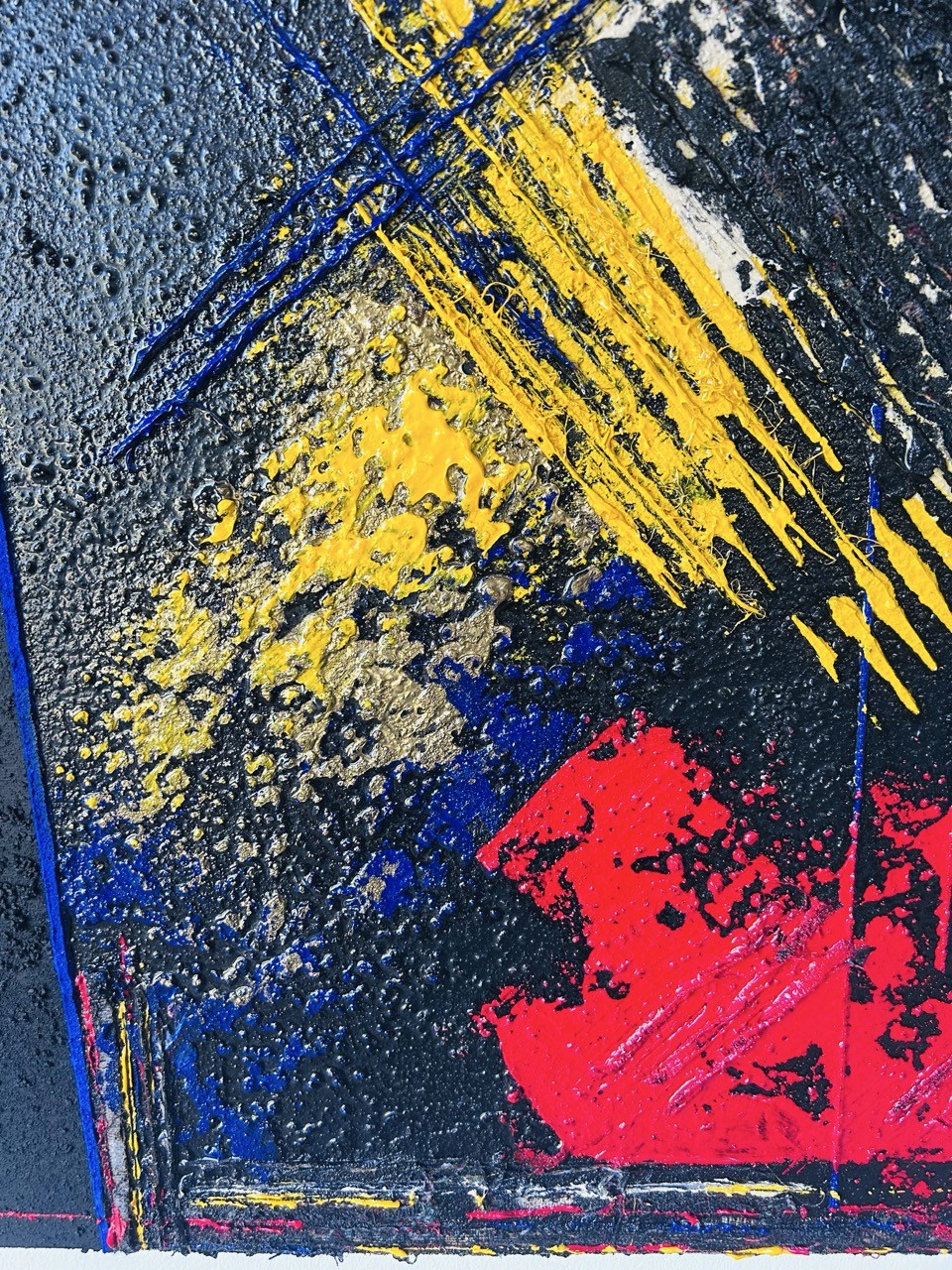 Les lignes horizontales gravées dans la matière évoquent une écriture ancienne, comme un journal silencieux de ce qui ne peut être formulé autrement. Autour, la matière est brute, rugueuse, mélange de mat et de brillant, d'opacité et de lumière, témoignant d'un va-et-vient entre chaos et clarté.