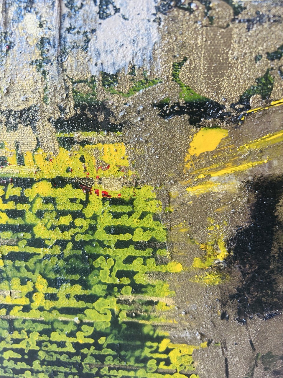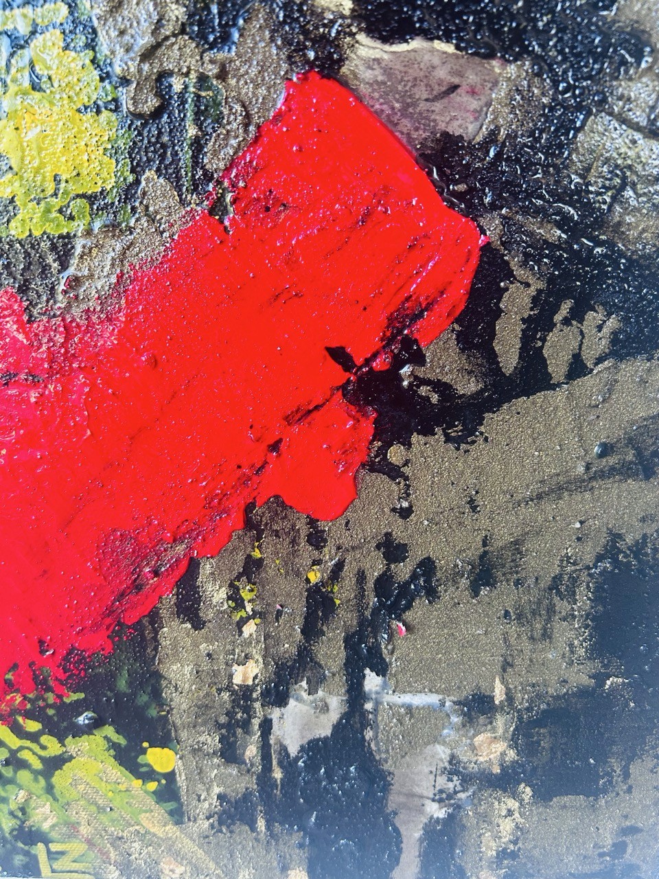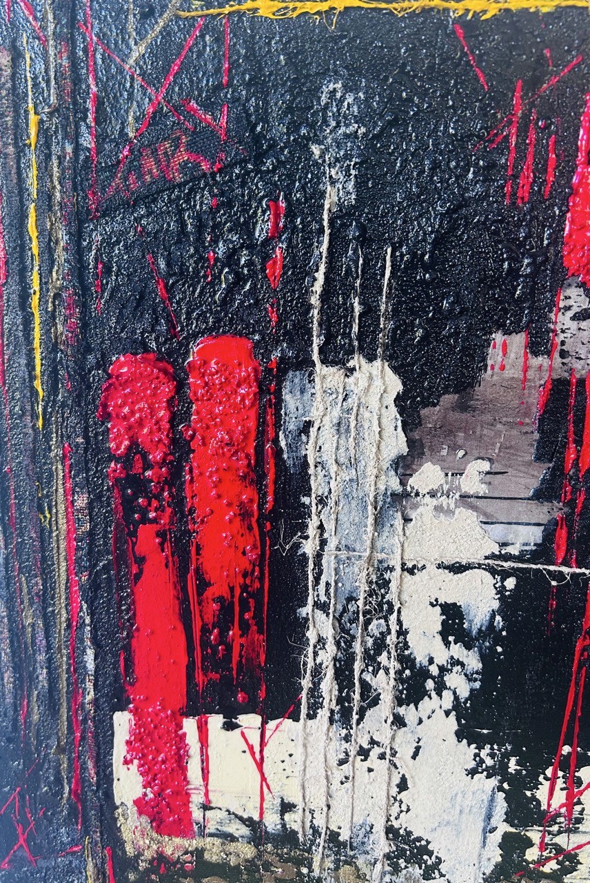 Une émotion éclatée, libérée, projetée. Les couleurs s'entrechoquent : rouge brûlant, jaune éclatant, bleu profond, et le doré, éclat de lumière, comme une pensée sacrée qui transperce le chaos.