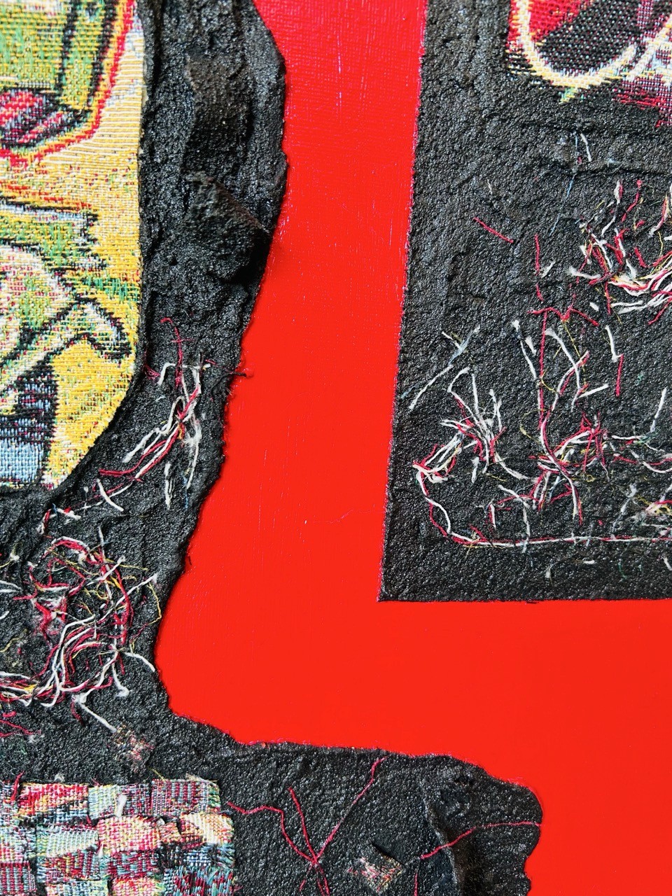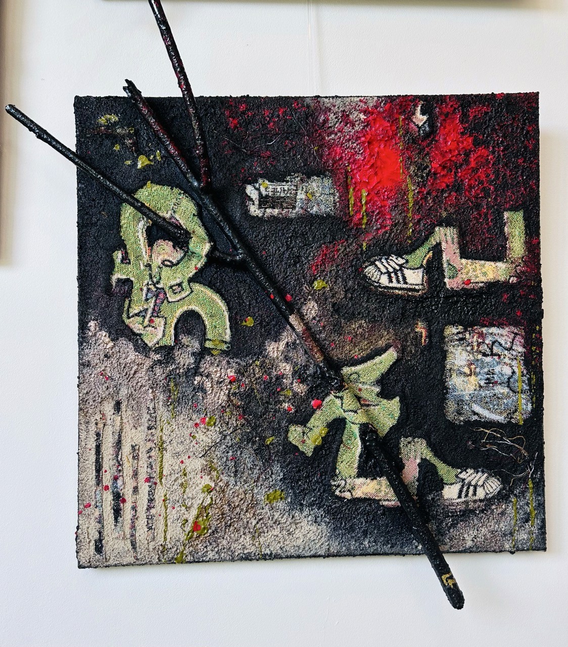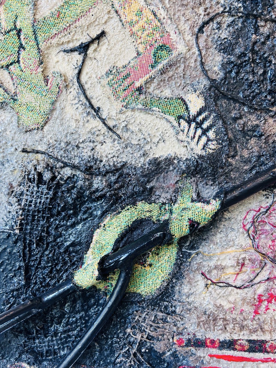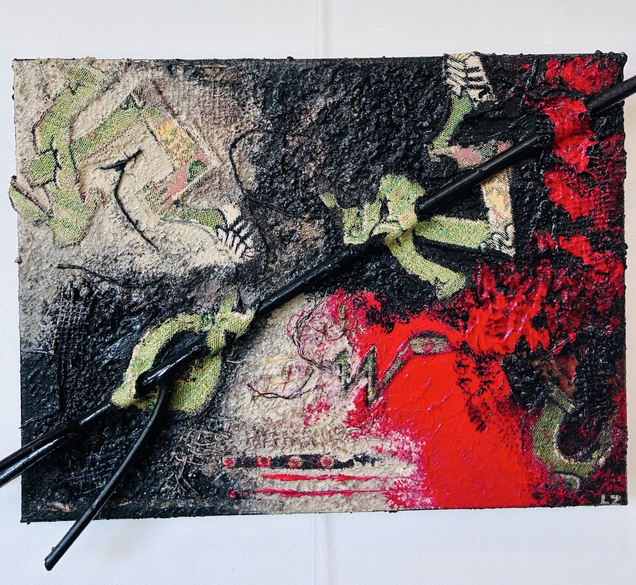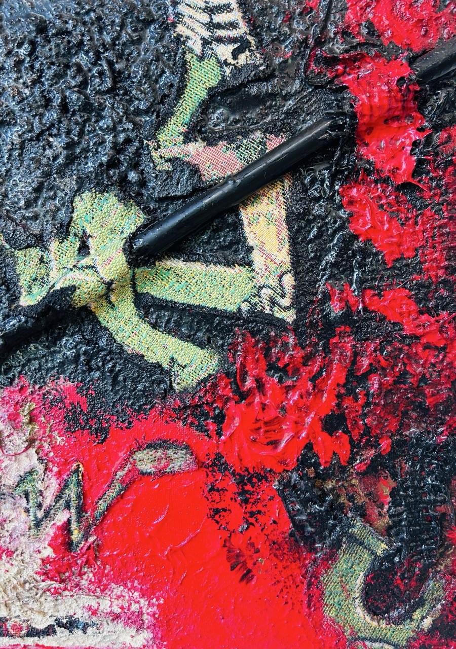 Une coulée rouge fend l'espace, directe, viscérale. Elle est la faille, le fil rouge d'une blessure intime toujours ouverte. Autour, le chaos s'installe : des pieds semblent pris dans des morceaux de bois enchevêtrés, des formes sont nouées, brisées. Une âme se débat, décousue, en déséquilibre, à la recherche de son axe.