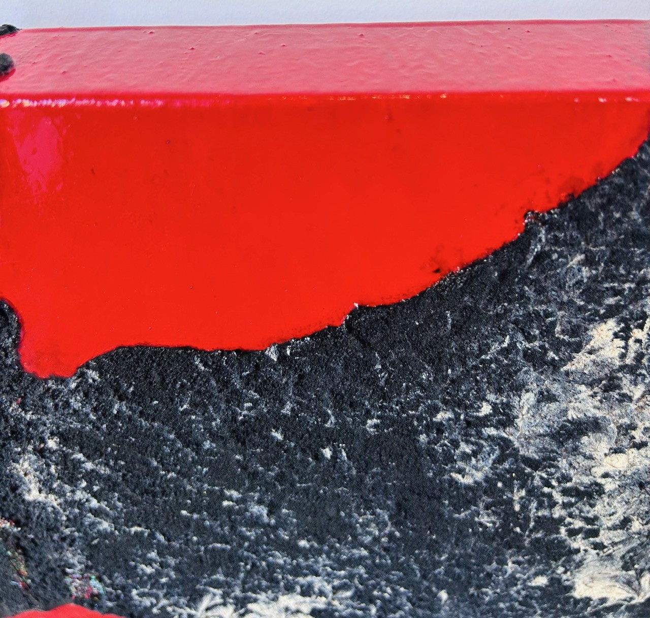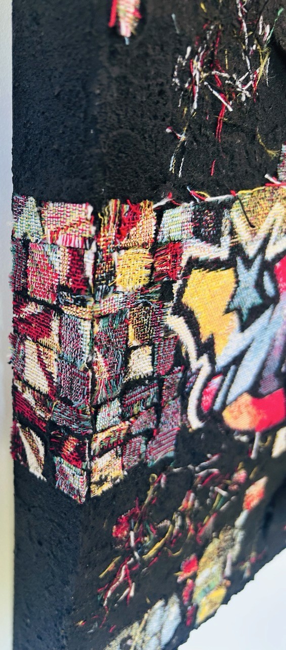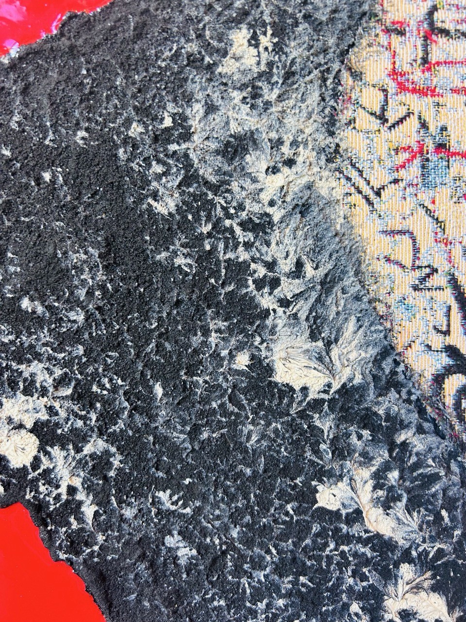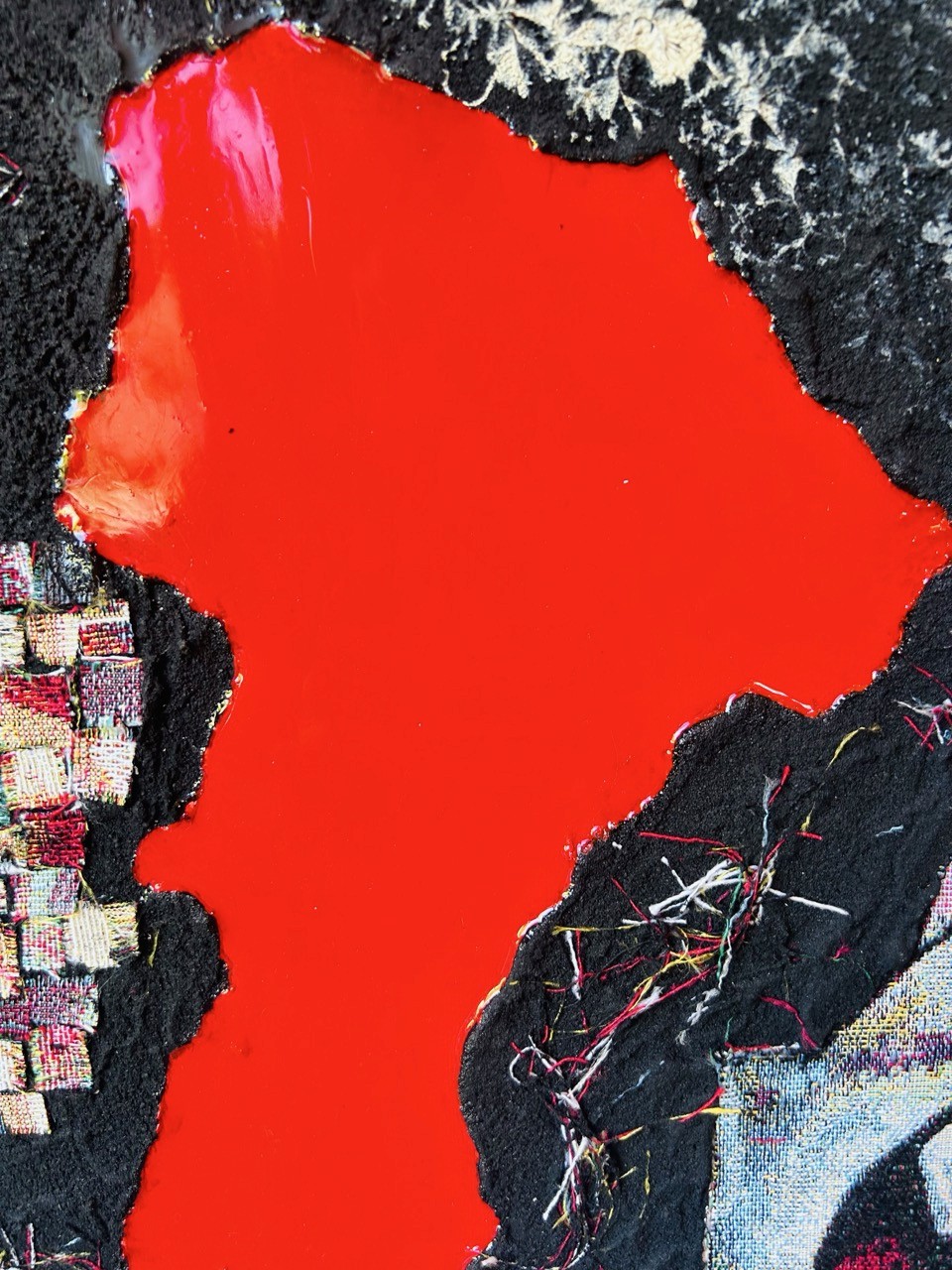 La surface est ponctuée de fissures légères, de tissus arrachés ou posés, comme des morceaux de vécu. Ils ne sont pas encore liés, mais tendent vers une unité invisible, imperceptible pour le moment — une unité à venir.