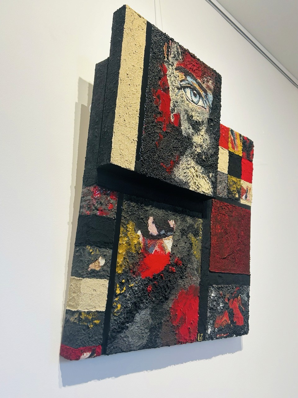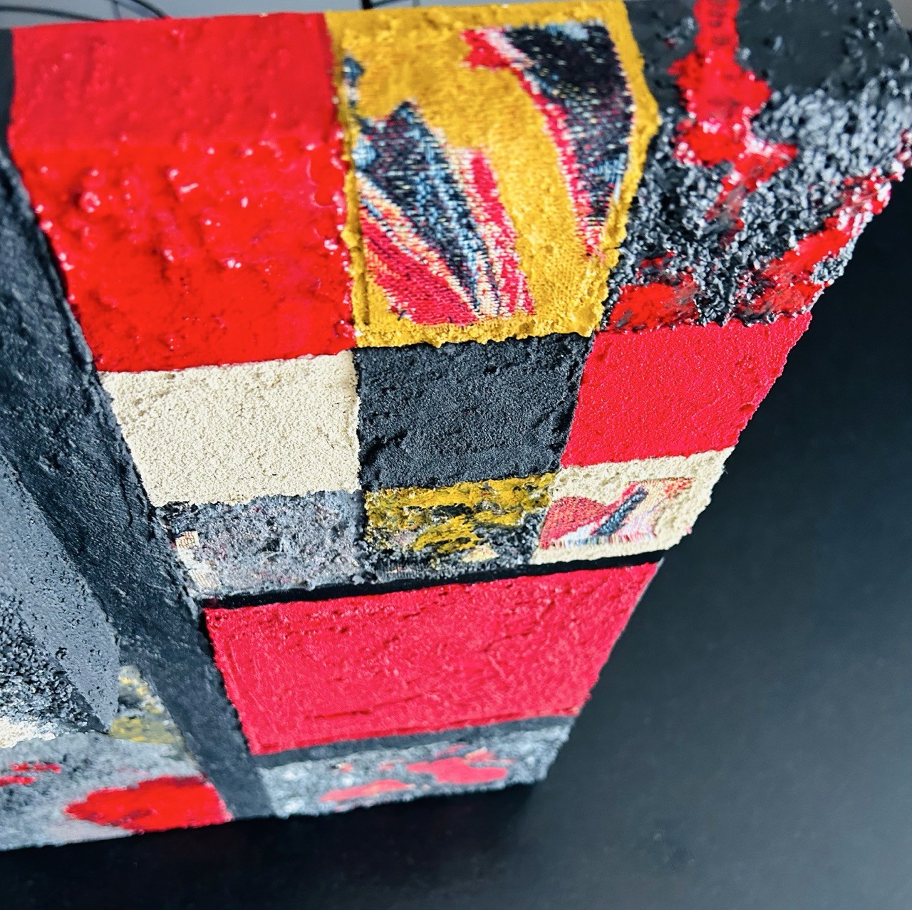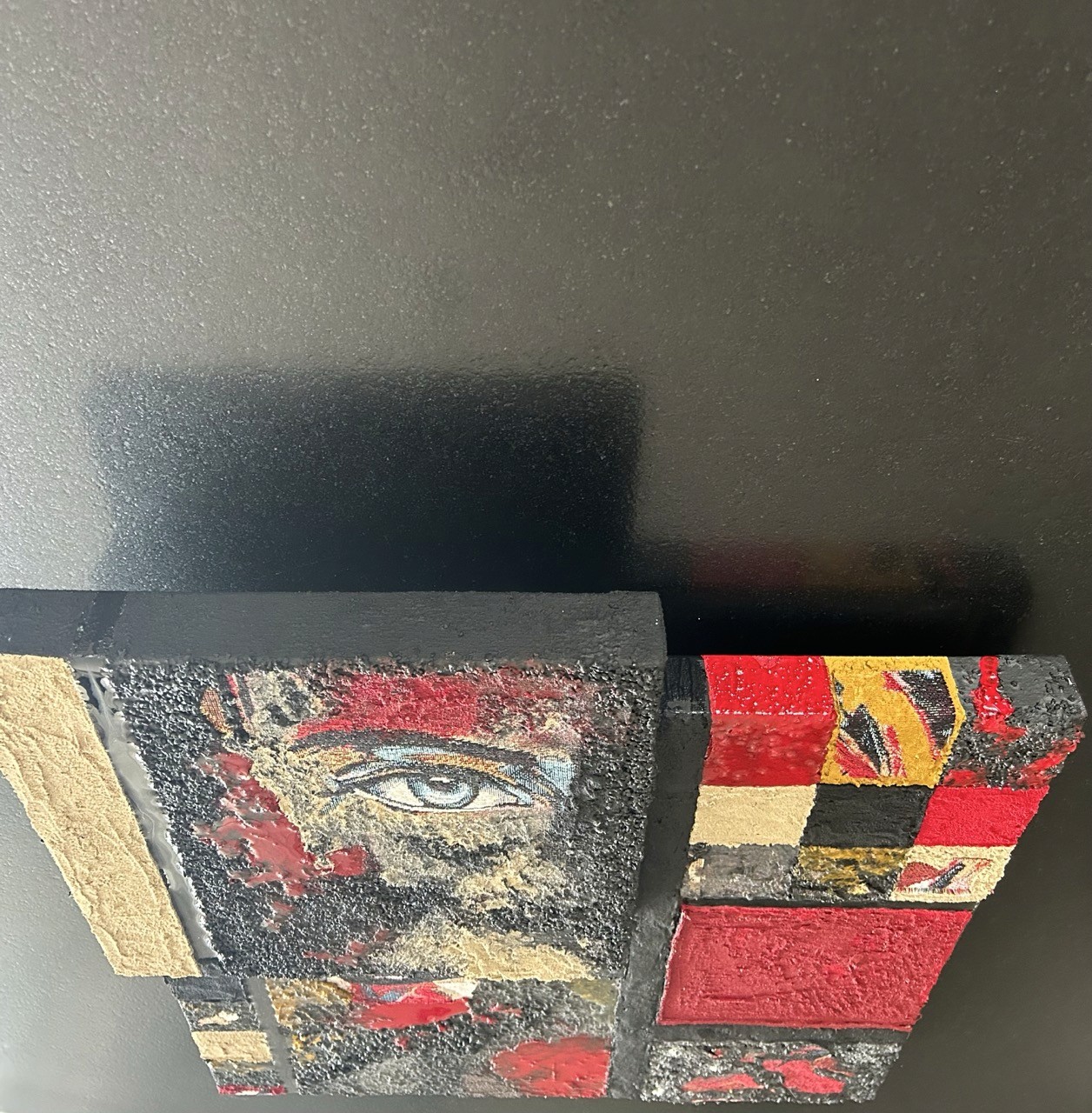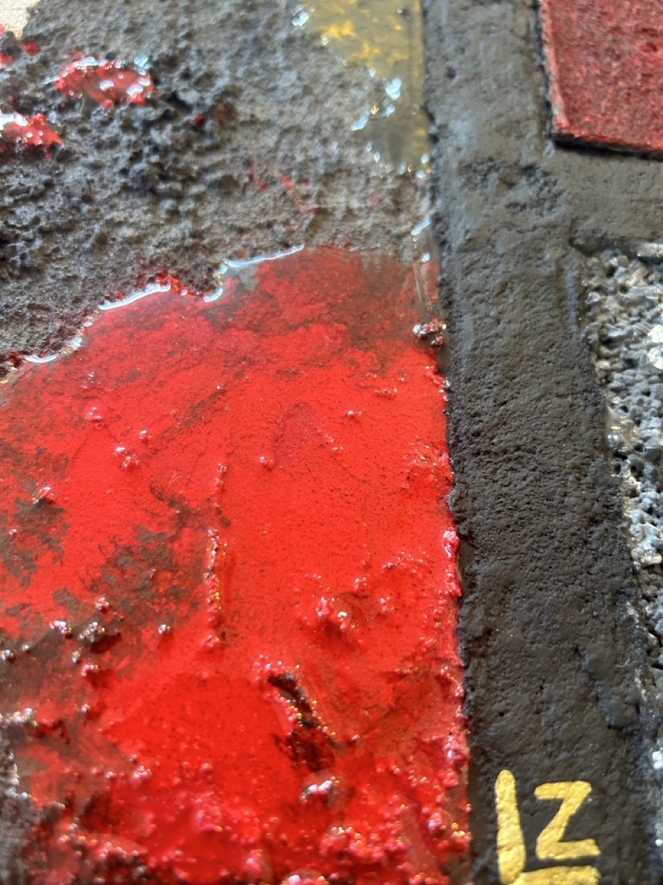La surface est traversée de matières rugueuses, de gestes interrompus, de lignes tantôt rigides, tantôt vacillantes. On y perçoit la mémoire du mouvement, l'effort de tenir et de lâcher à la fois. Par endroits, la résine accroche la lumière. Elle crée des effets miroir, fragiles, presque furtifs — comme des reflets intérieurs, des éclats de conscience ou de vérités effleurées.